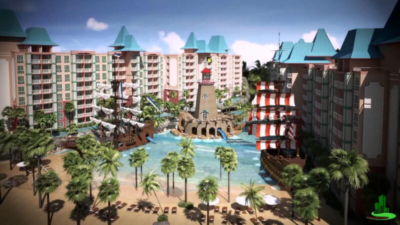 Grande Caribbean Condo Resort is a themed living experience featuring four eight-storey buildings and a striking thirty-storey tower set amidst lush tropical gardens, expansive pools, and interactive pirate ships.