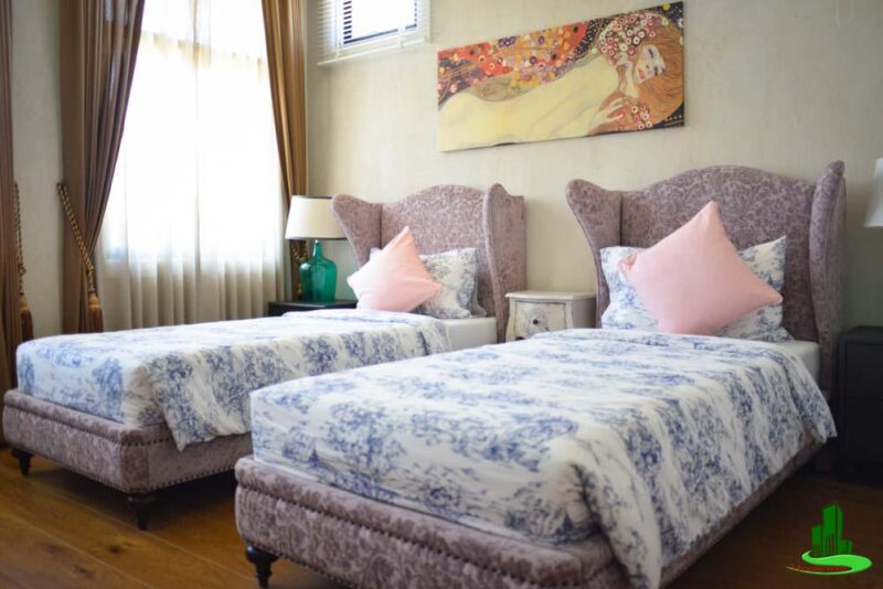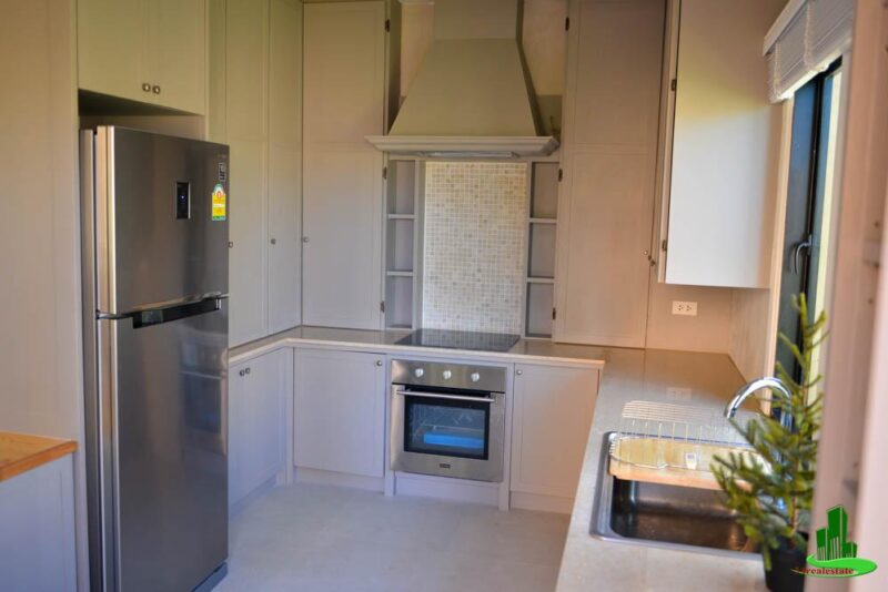 This luxurious 2-storey three-bedroom property is situated on a 100 sq. wah (400 sq. m.) plot of land. The home features a lovely landscaped garden and a private swimming pool. On the ground floor, there is a spacious living and dining area, a fitted European kitchen, a guest toilet, and one bedroom with an en-suite bathroom. The other two bedrooms are situated on the second floor and both have en-suite bathrooms. The home is bright and airy, has full air conditioning, and offers private parking.