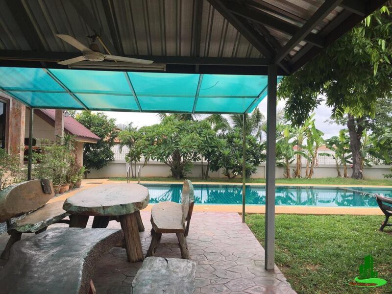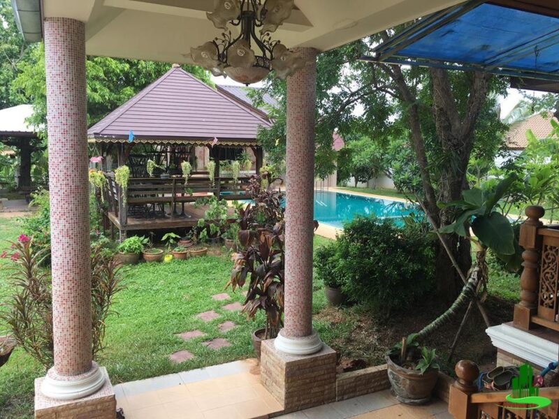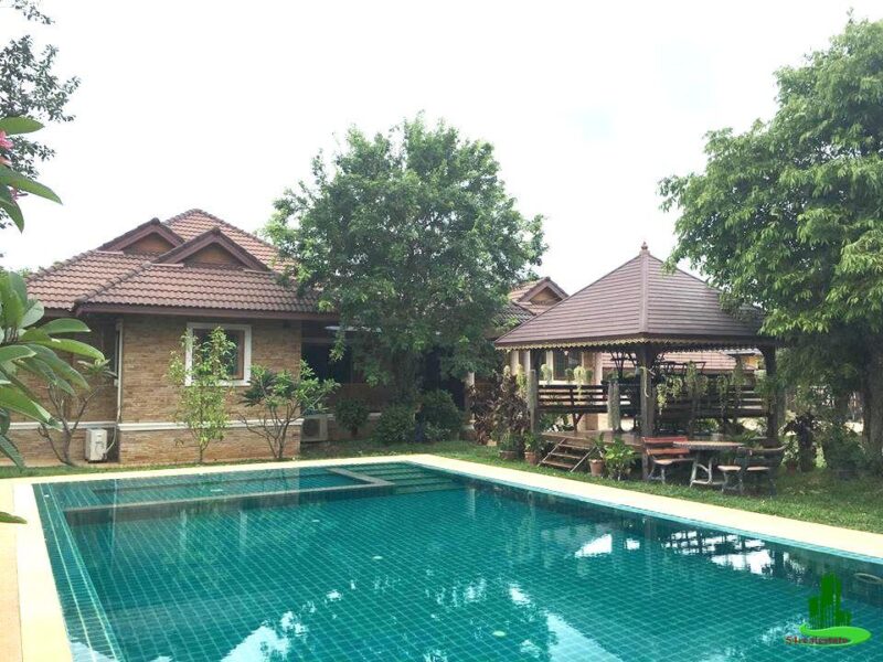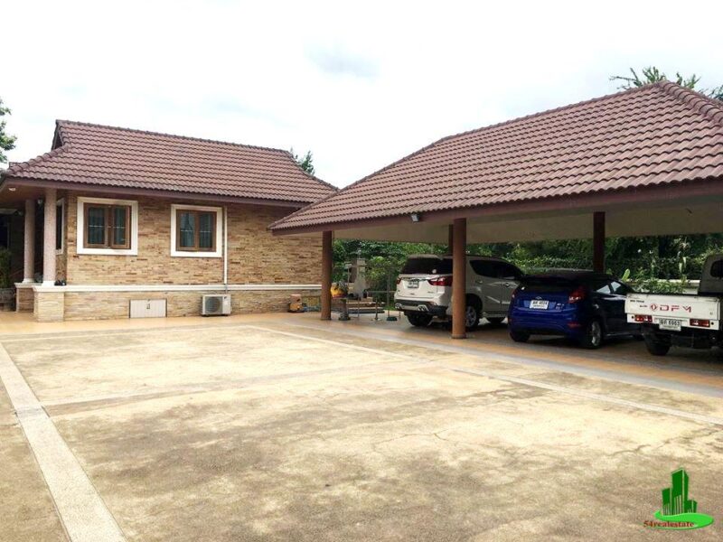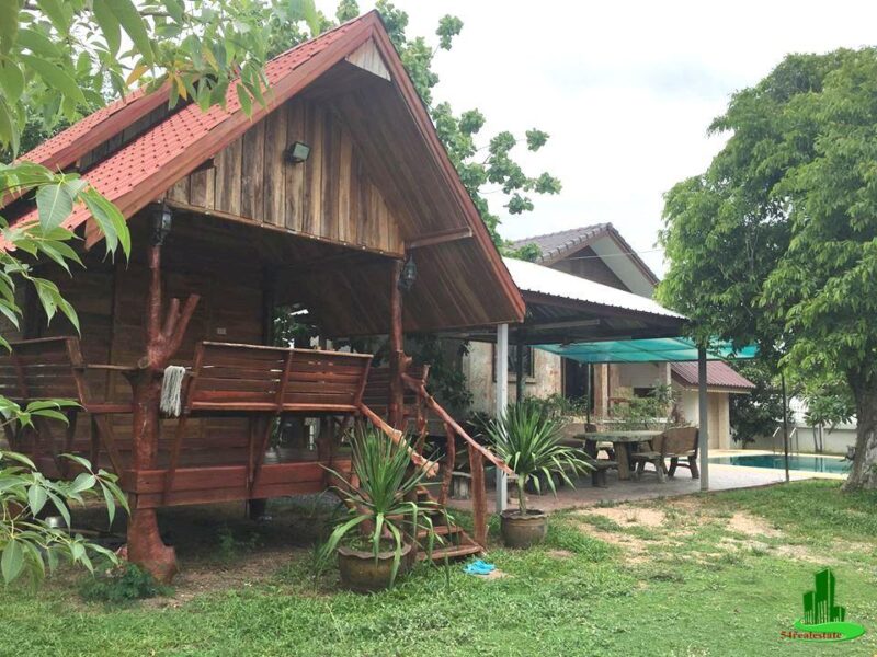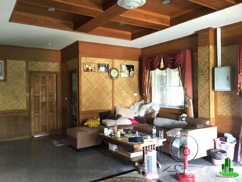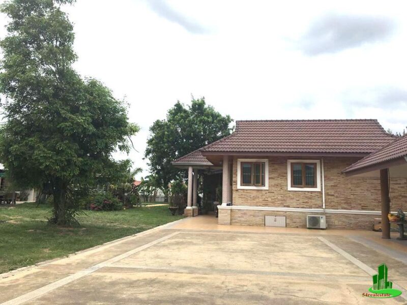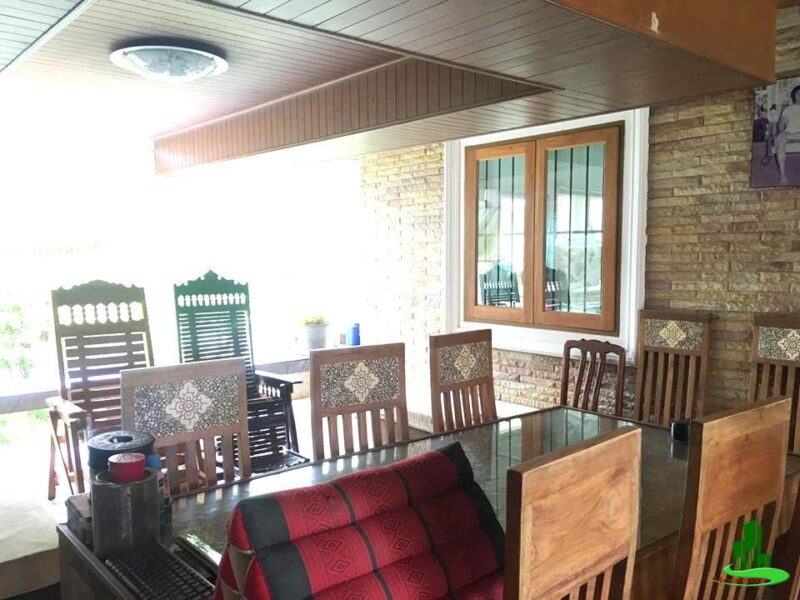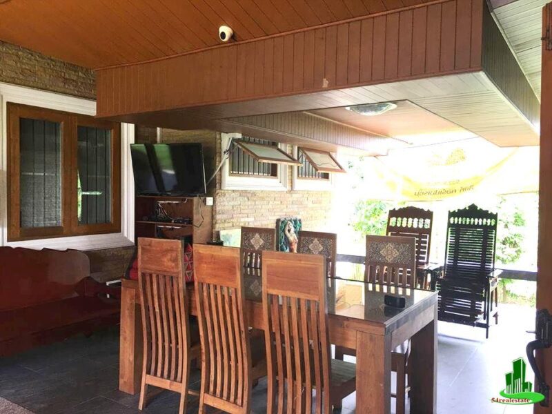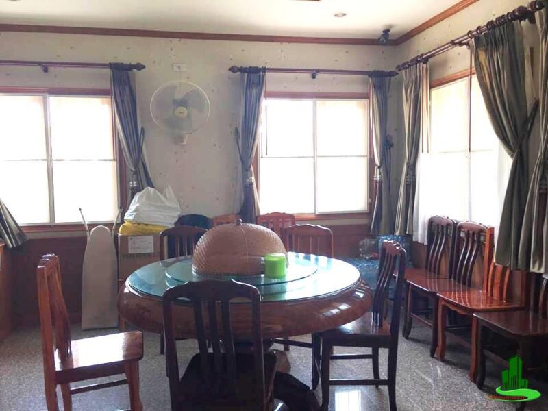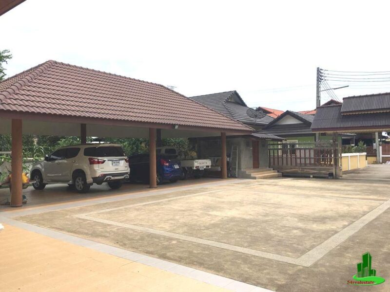 2 houses for sale in Huaiyai, east of Pattaya. The land size is 2000 square meters. The property includes 2 Thai style guest houses, totaling 7 bedrooms and 7 bathrooms. It also features a living room, kitchen, and dining area. The floors are tiled and the property is fully furnished and decorated. There is a built-in kitchen and covered parking.
