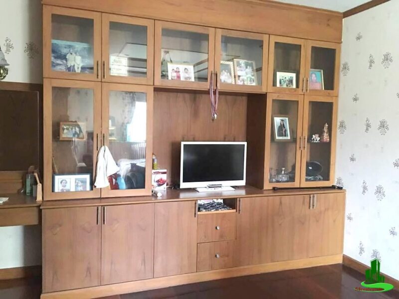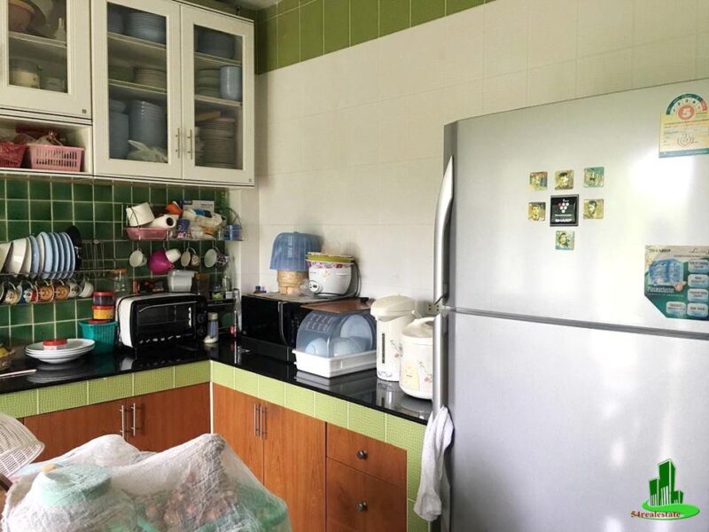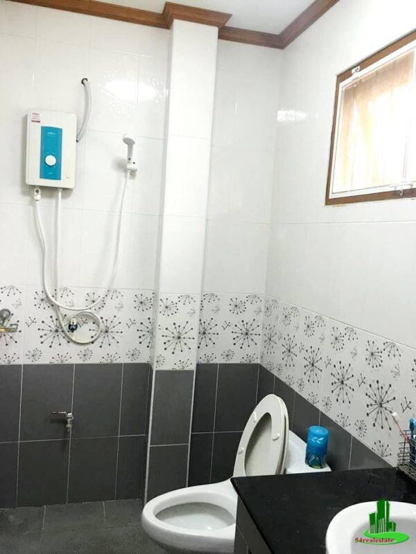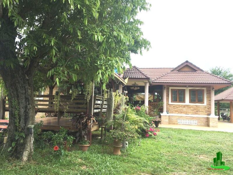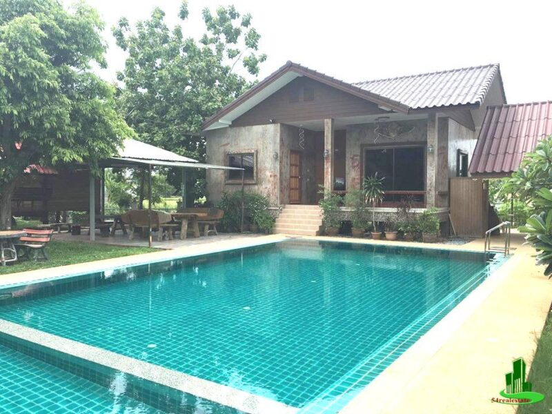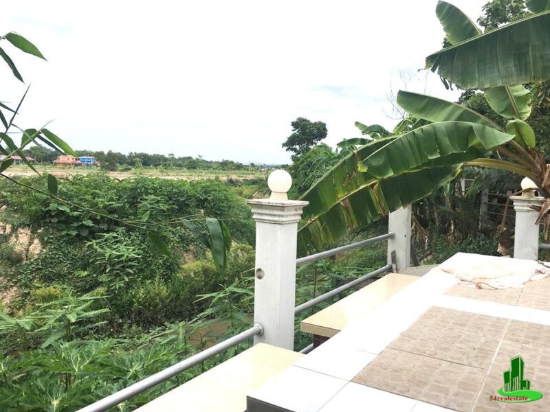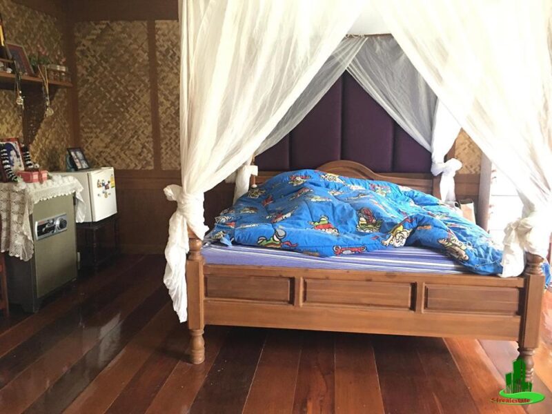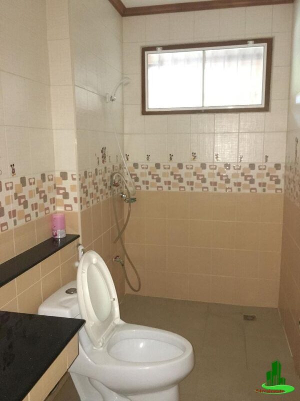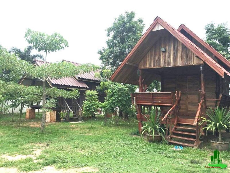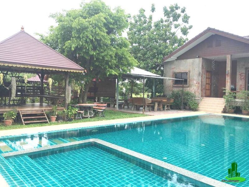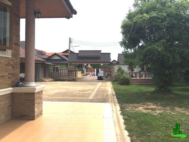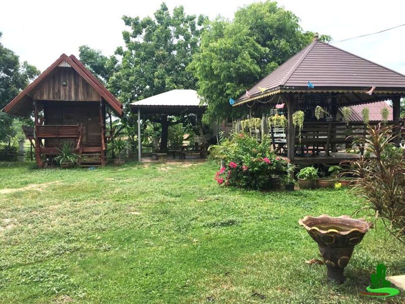 2 houses for sale in Huaiyai, east of Pattaya. The land size is 2000 square meters. The property includes 2 Thai style guest houses, totaling 7 bedrooms and 7 bathrooms. It also features a living room, kitchen, and dining area. The floors are tiled and the property is fully furnished and decorated. There is a built-in kitchen and covered parking.