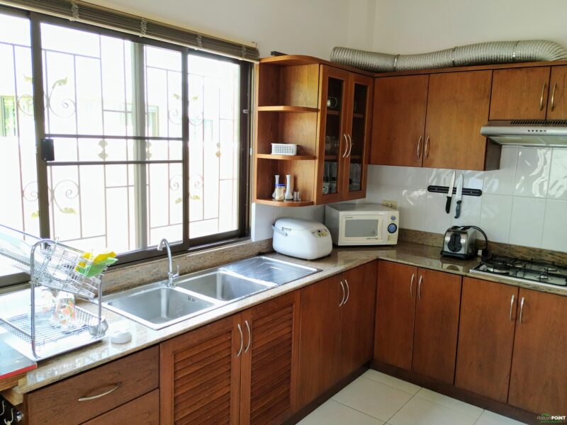 The house is fully furnished and air conditioned, with a fully furnished European kitchen that includes a washing machine.