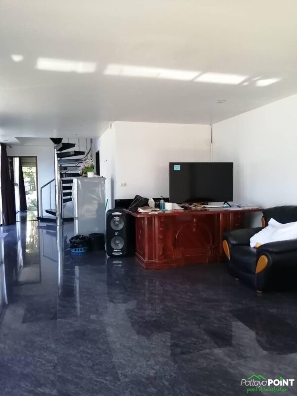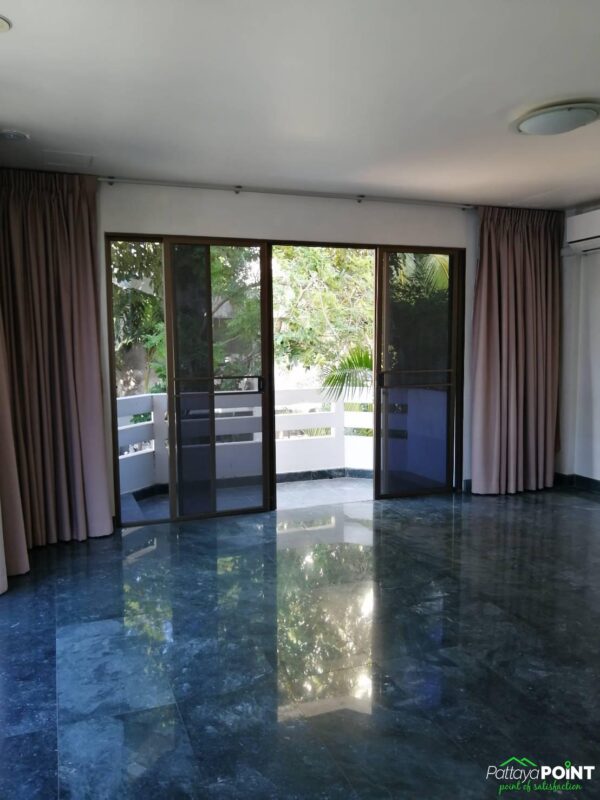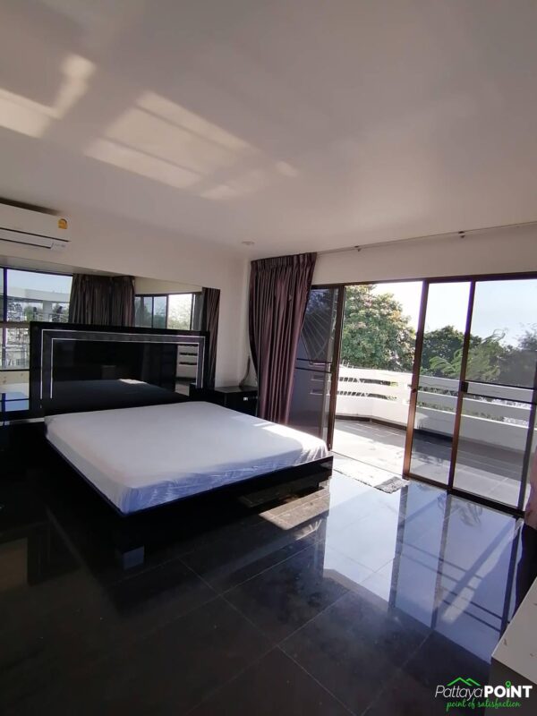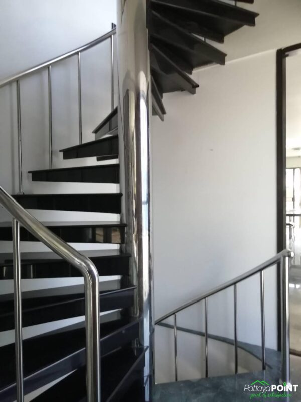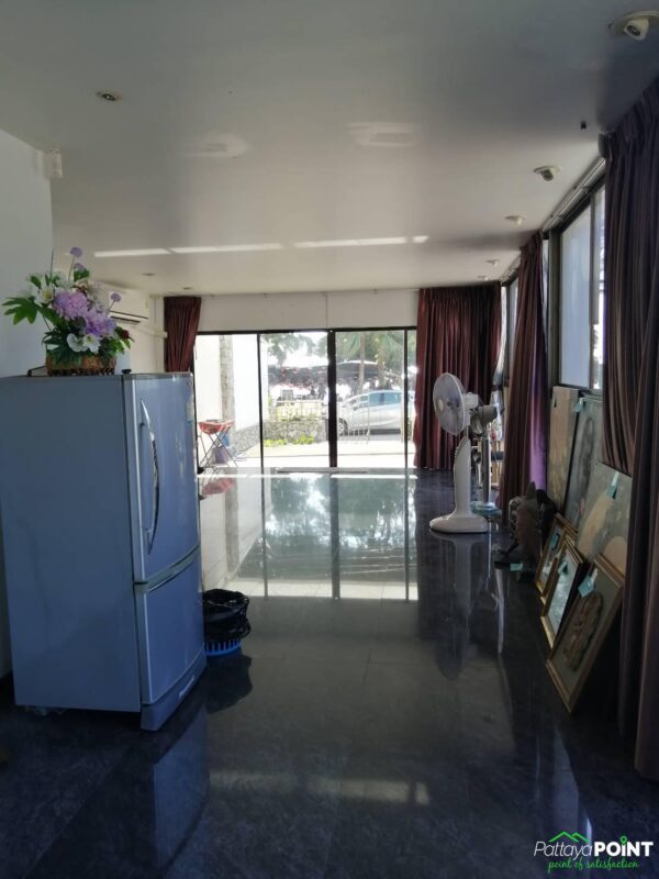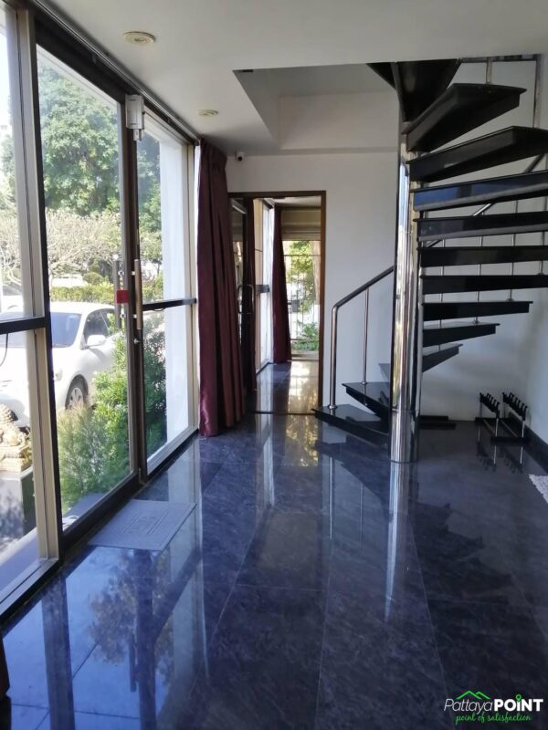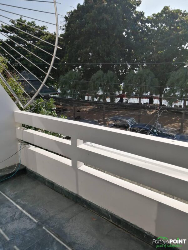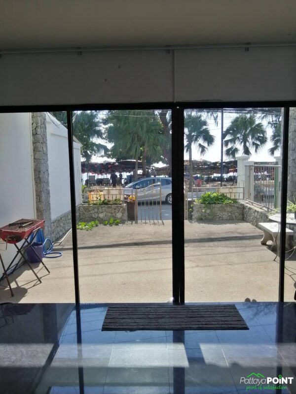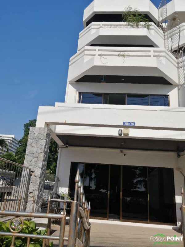 4-storey beachfront townhouse for sale at Jomtien Beach, Pattaya. The area is 29.7 square wah or 120 square meters. It has 5 bedrooms and 6 bathrooms. The townhouse is unfurnished but has a balcony with a front sea view and pool view. It includes water, communal parking, communal swimming pool, and a security guard. The common fee is 17,915 baht per year. The townhouse is under company ownership. It is located near restaurants and a mini-mart, and it’s only a 10-minute drive to entertainment in Pattaya.