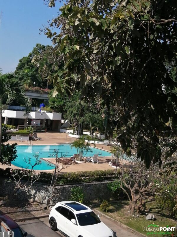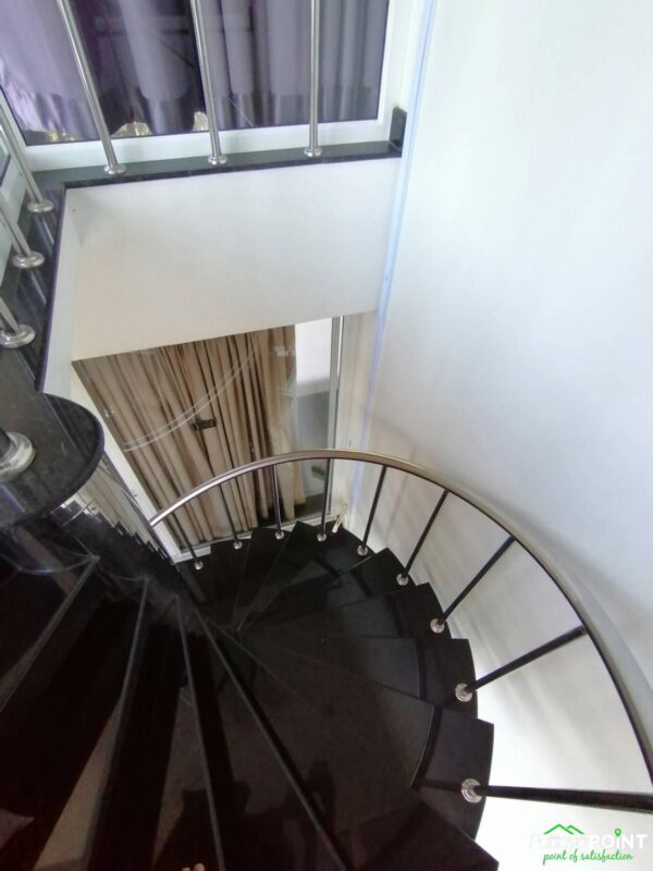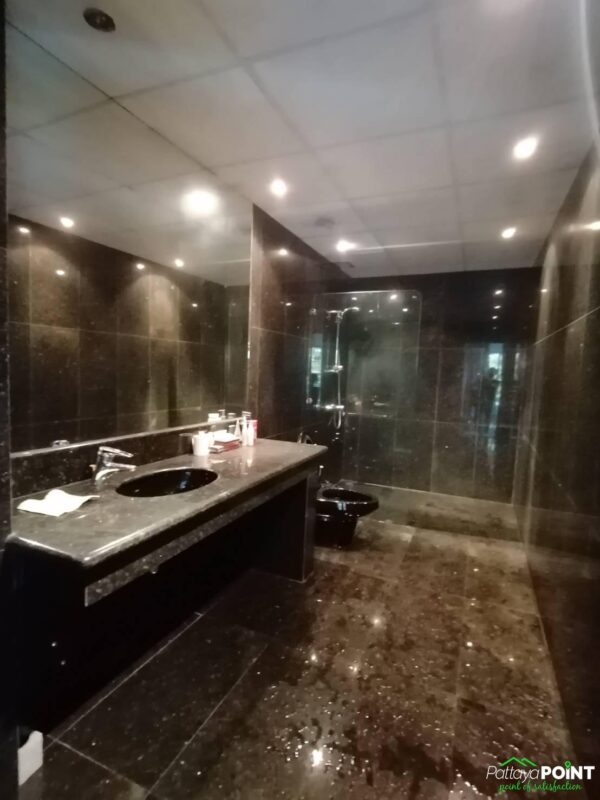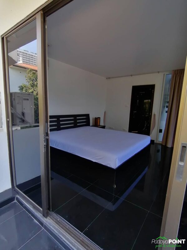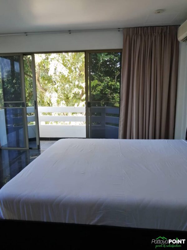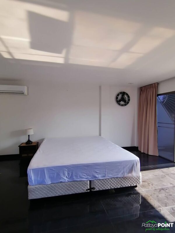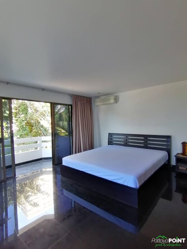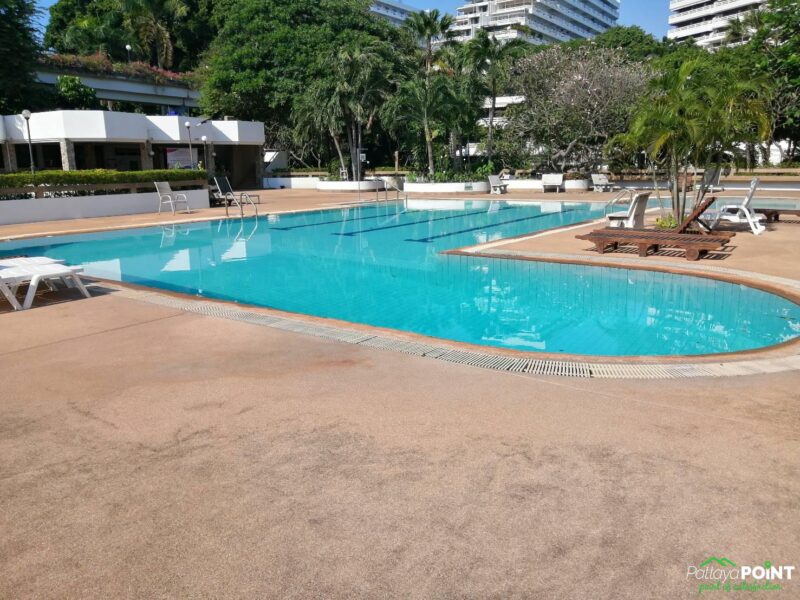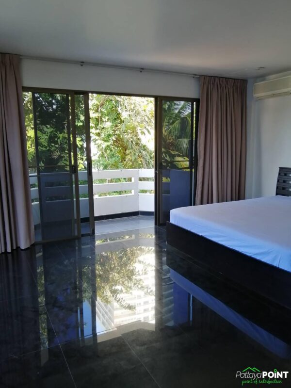 4-storey beachfront townhouse for sale at Jomtien Beach, Pattaya. The area is 29.7 square wah or 120 square meters. It has 5 bedrooms and 6 bathrooms. The townhouse is unfurnished but has a balcony with a front sea view and pool view. It includes water, communal parking, communal swimming pool, and a security guard. The common fee is 17,915 baht per year. The townhouse is under company ownership. It is located near restaurants and a mini-mart, and it’s only a 10-minute drive to entertainment in Pattaya.