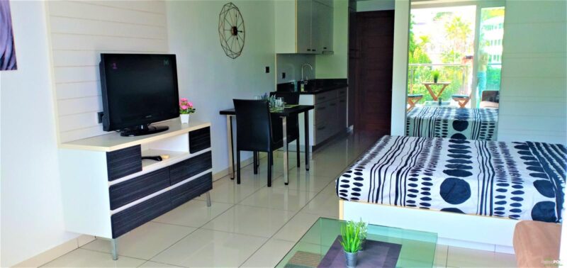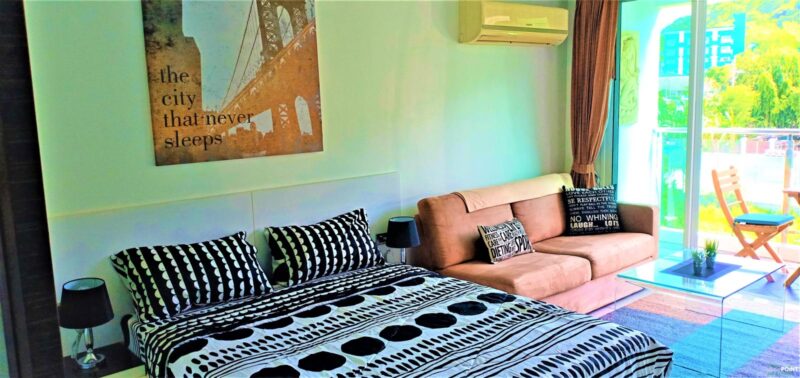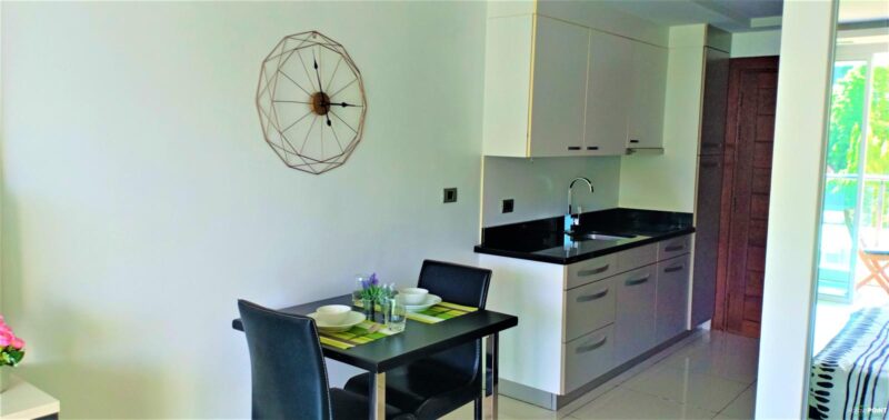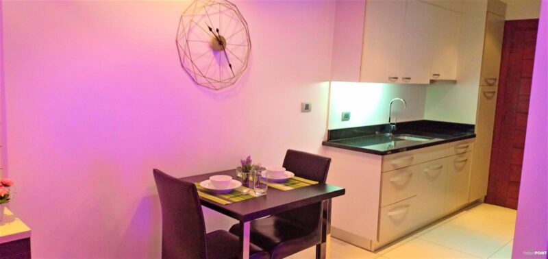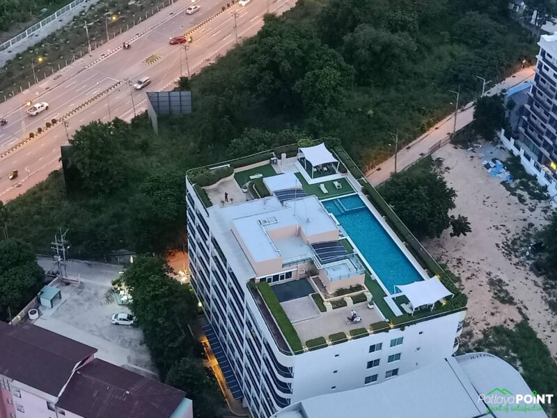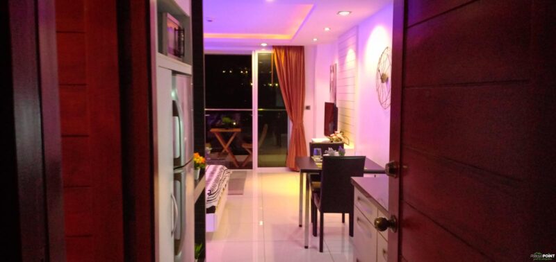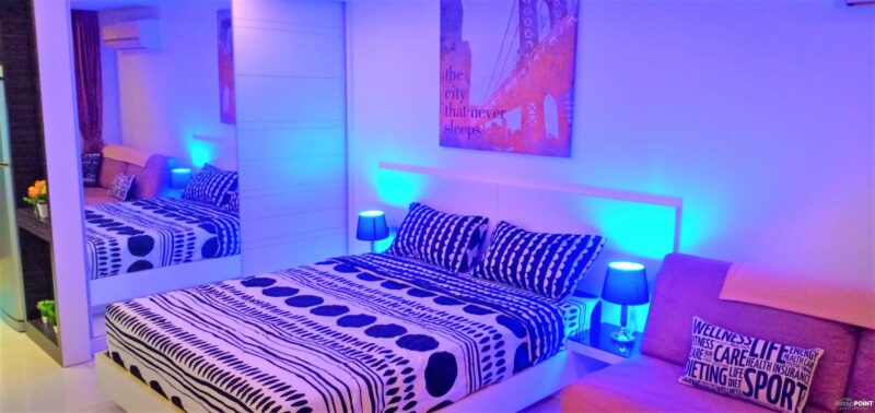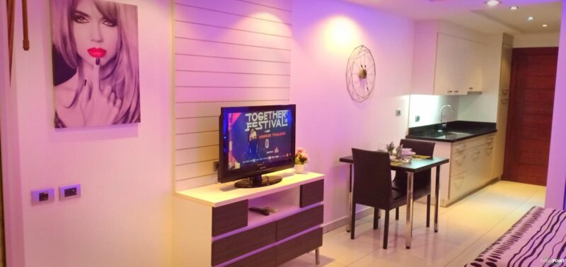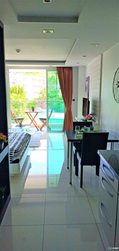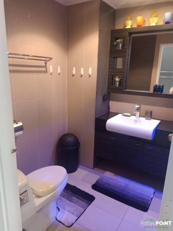 Studio room, size 35 sq. m, 15th floor, fully furnished, 1 bathroom, air conditioning. European kitchen with dining table. Cable TV and Wi-Fi internet. Balcony with city view. Communal rooftop pool and gym. 24-hour reception and underground parking. Taxi route near restaurants. Just 15 minutes walk to Walking Street and Pattaya Bali Hai Pier.