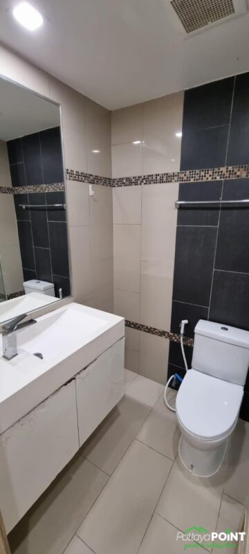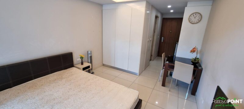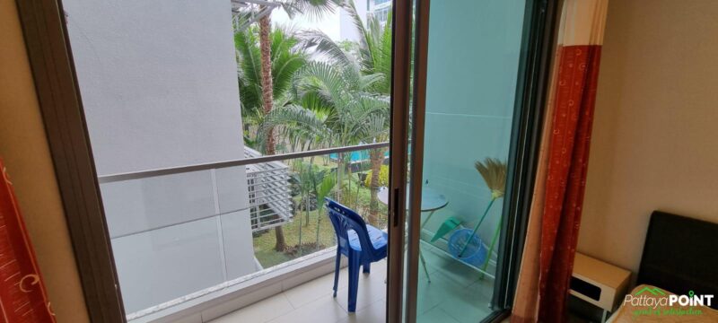 Studio with a pool view, measuring 26 square meters on the 2nd floor. The unit is fully furnished and includes 1 bathroom, a balcony with a pool view, an elevator, a communal pool, a fitness center, a playground/kid area, a sauna, a garden BBQ, CCTV, Wi-Fi, parking, and 24-hour security. The apartment is conveniently located near a mini mart and restaurants. It is just a 15-minute walk to the beach and a 5-minute drive to Pattaya Entrainments.