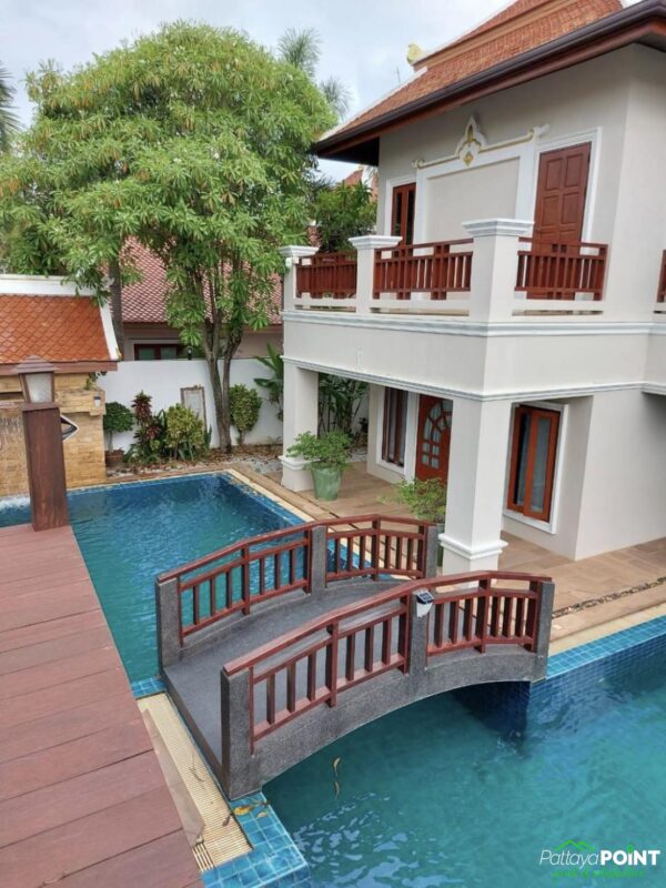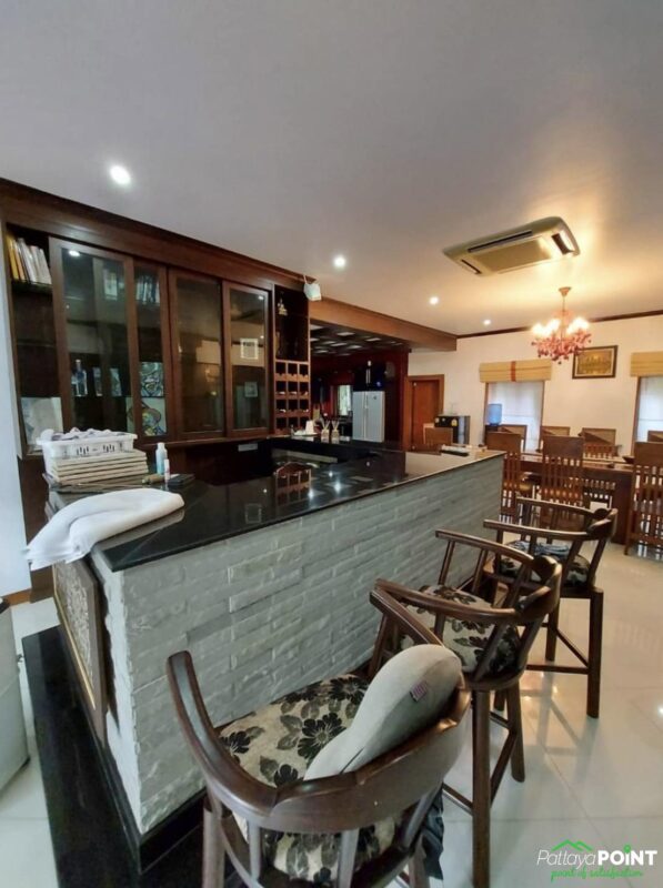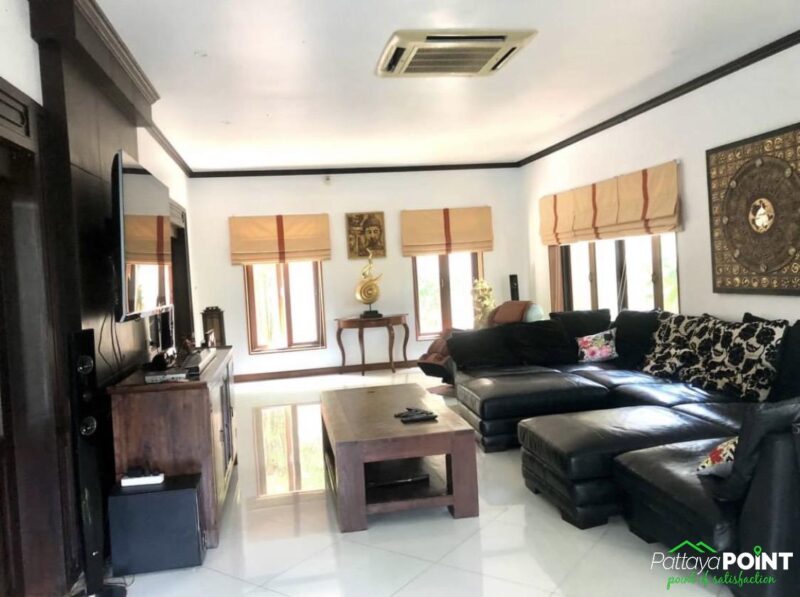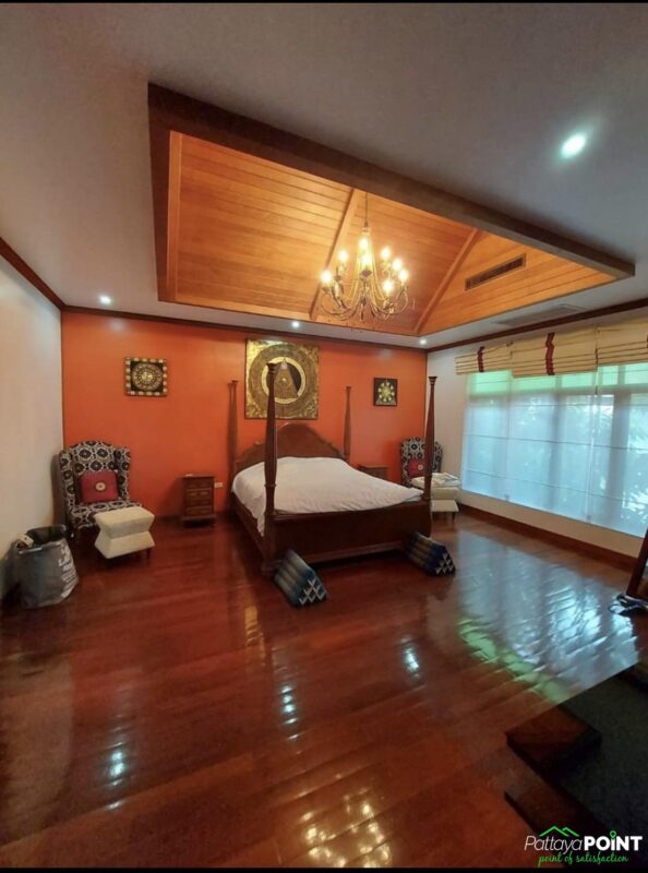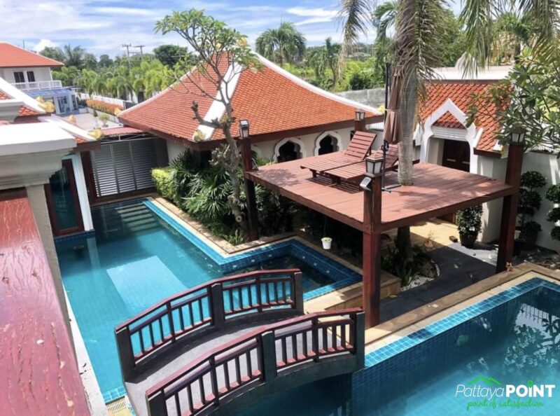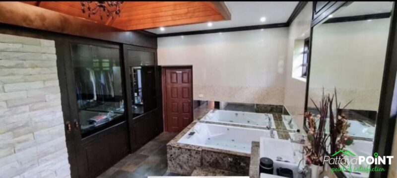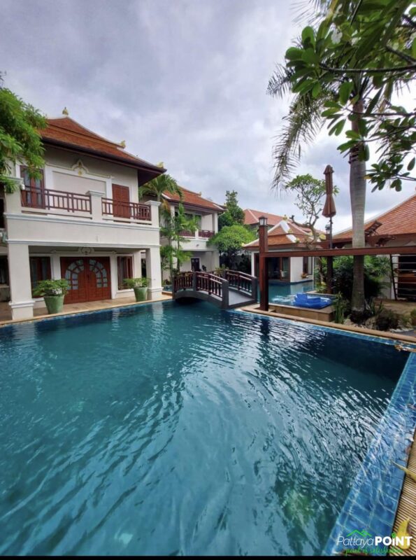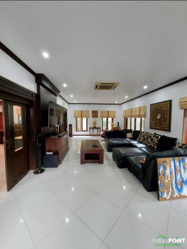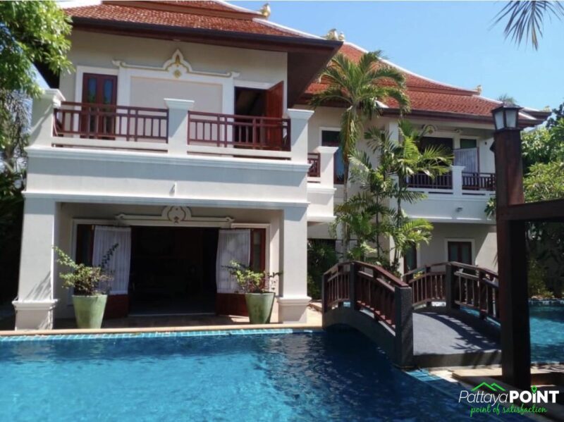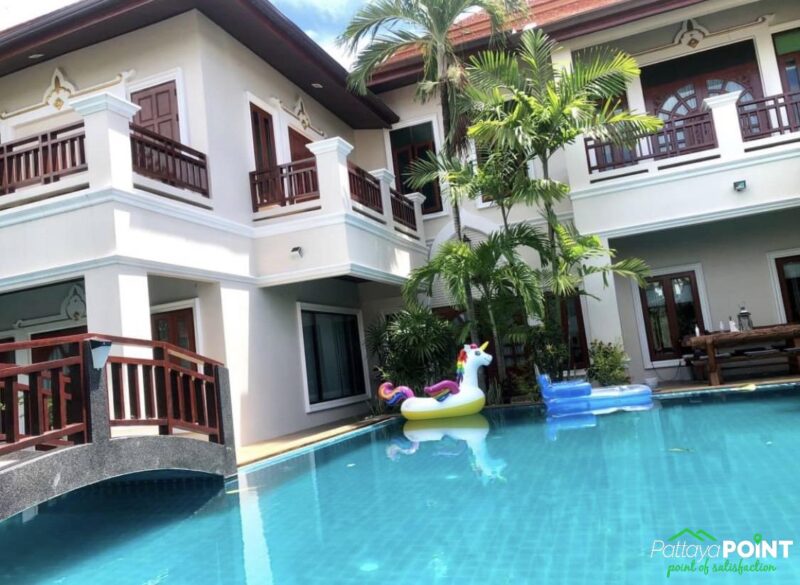6 bedrooms, 6 bathrooms, 2 living rooms, European kitchen, big private swimming pool, garden for BBQ. There are no common fees. The property is under company ownership and is close to the local market and international school. It is just a 10-minute drive to the beach and Pattaya entertainments.