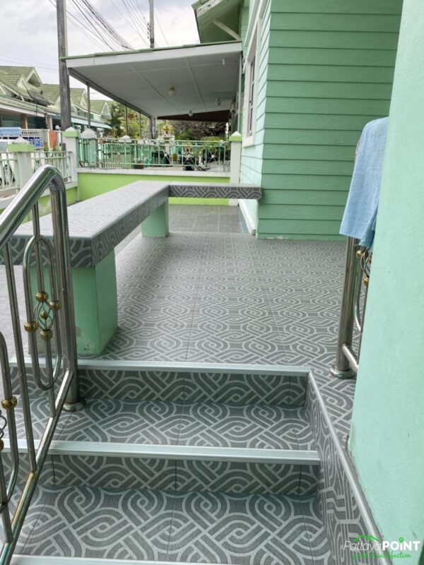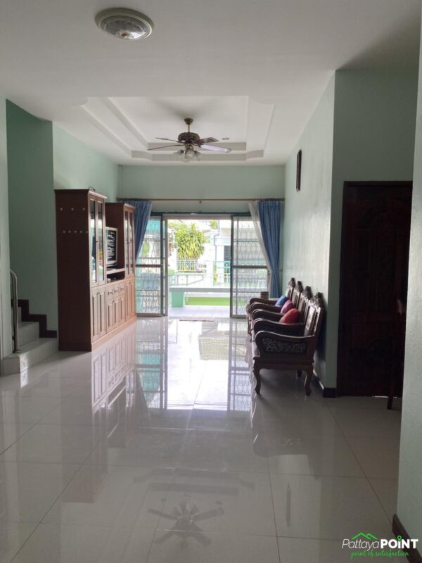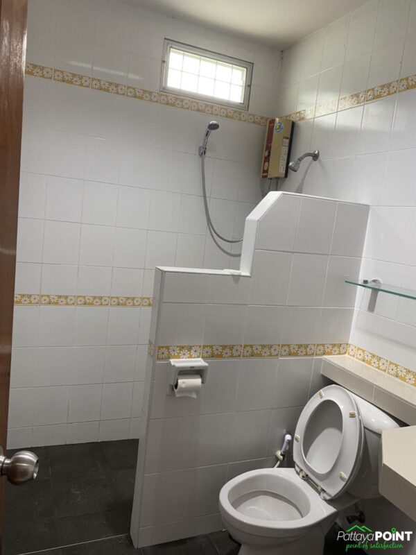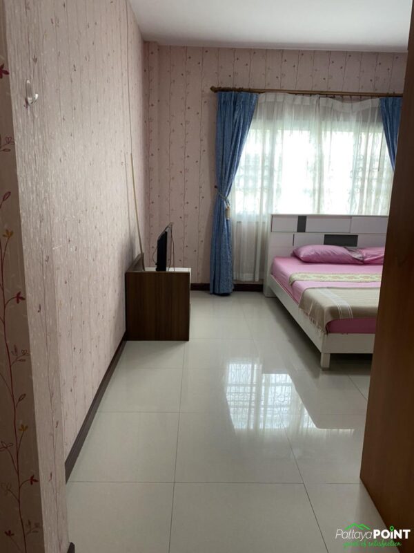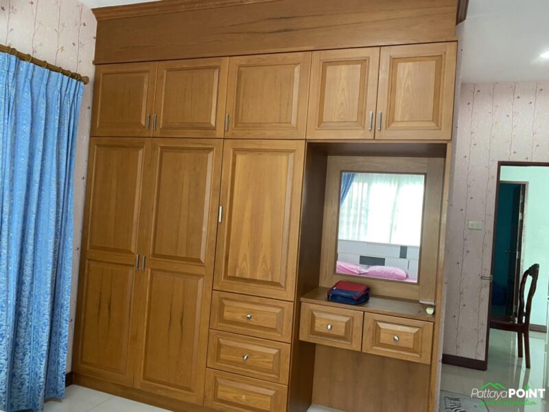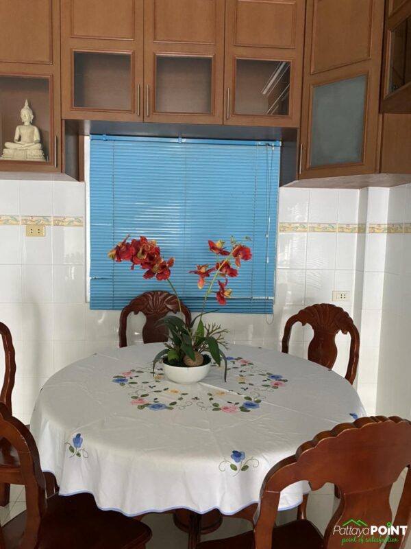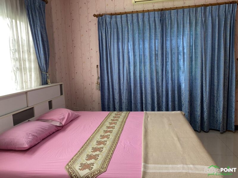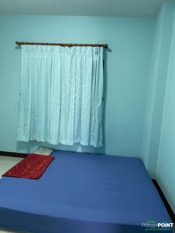 Two-storey house with 4 bedrooms and 2 bathrooms is available for sale and rent in the North Pattaya area. It is conveniently located near the main road, making it easy to travel. The house is partially furnished and includes indoor parking. Additionally, there is a common swimming pool for residents to enjoy. Each bedroom is equipped with an air conditioner. The house features a spacious Thai kitchen with a large refrigerator and a family dining table.
