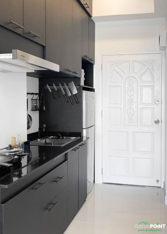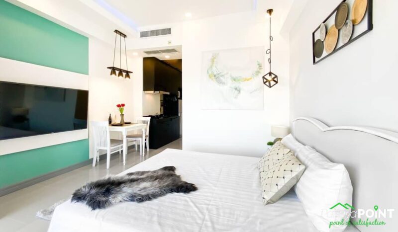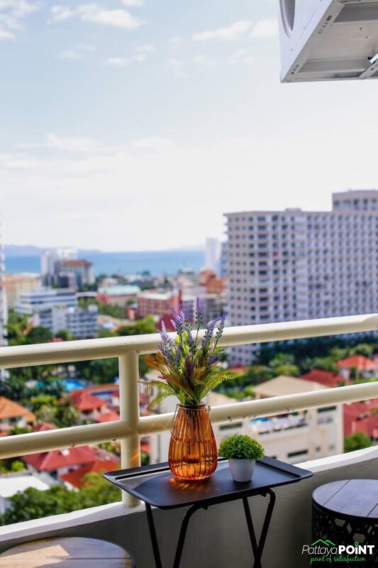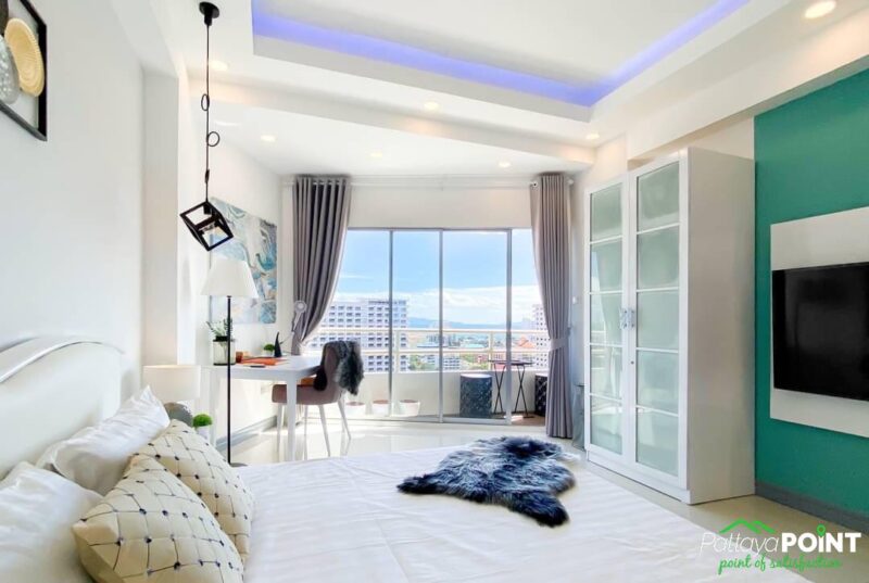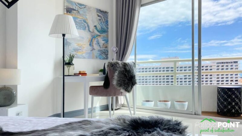 Beautiful renovated condo for sale at View Talay 1 with sea views. This is a studio condo with sea views that is totally brand new. It is furnished and decorated with high-quality materials and a modern style. The unit is 29.6 sqm in size and includes a 55-inch Samsung smart TV with a LED backlit TV panel, a remote-controlled lighting system, and a balcony with Siberia wood flooring (sun protection, waterproof).