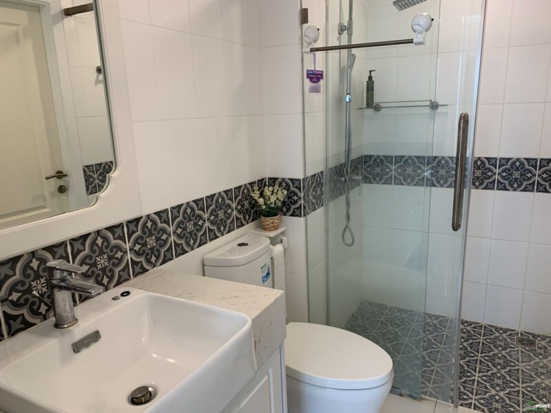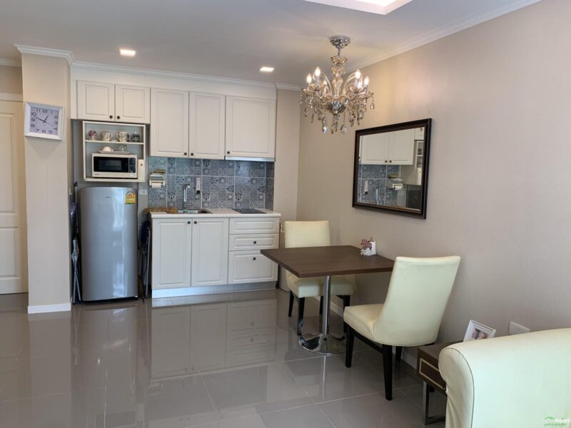 This unit is a one-bedroom condo located on the second floor. It comes with all new furniture and is available for rent at 10,000 THB per month, with a security deposit of two months.
