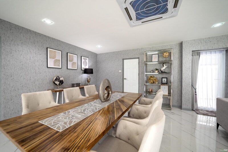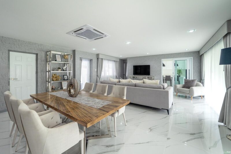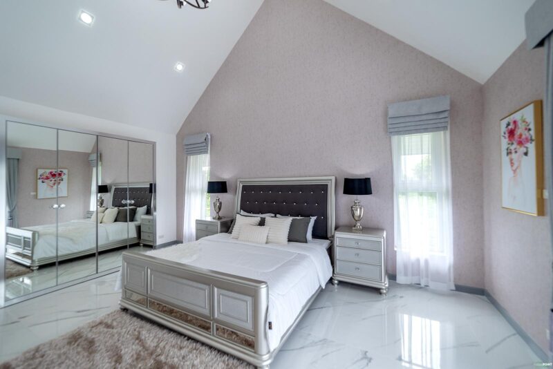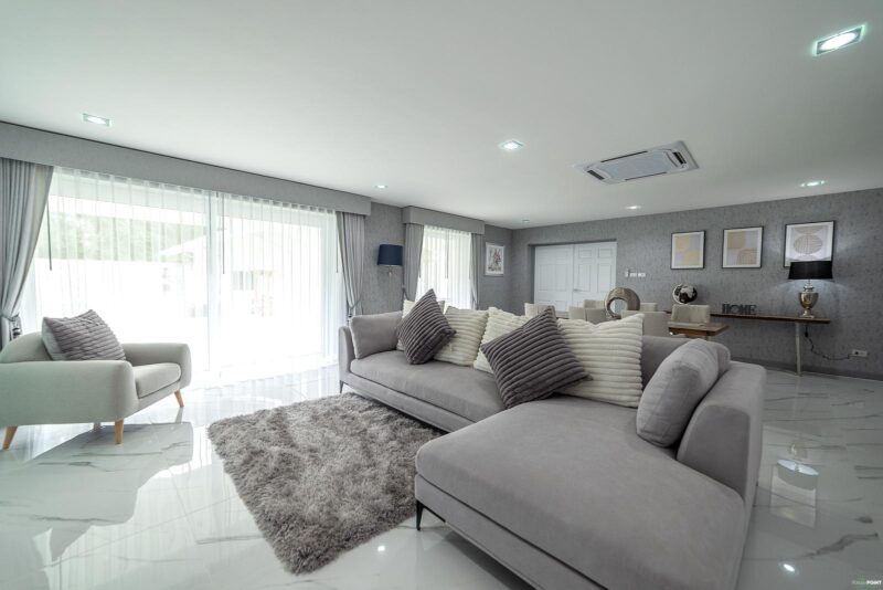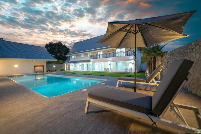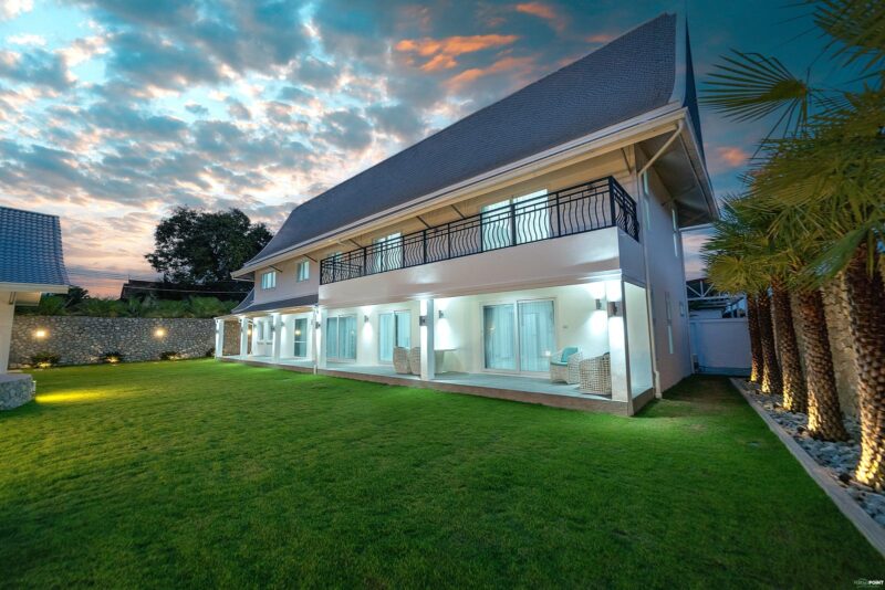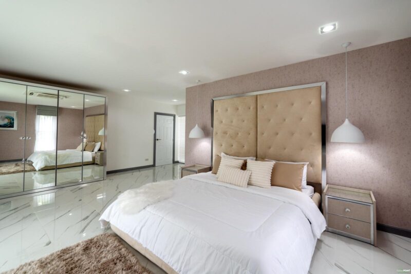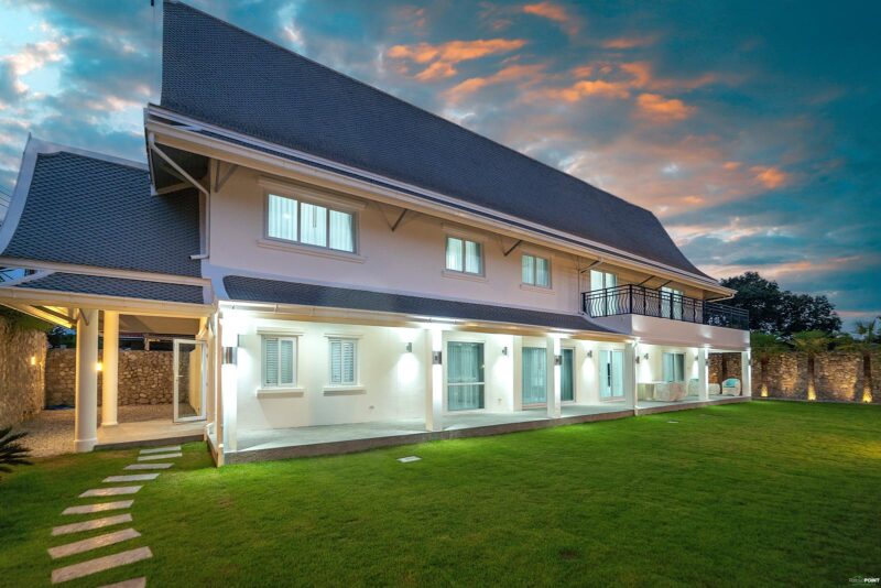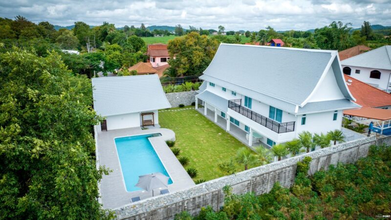 Newly renovated pool villa for sale on the east of Pattaya (Maprachan lake). The villa has 5 bedrooms, with 4 en-suite bathrooms and an additional 6th bathroom. It features a spacious Euro kitchen, a living room, and is fully furnished. The villa is equipped with Daikin air conditioning throughout. There is also a store room and a 3-car garage. The swimming pool measures 13.5 meters in length and 4 meters in width. The property is secured with CCTV cameras. The land area is 211 Tw (844 sqm) and the usable area is 461 sqm. The property is registered under a company name.