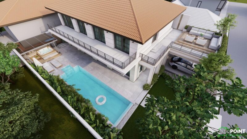 A beautiful 2-storey house is available for sale at Pratumnak Hill. This gated community offers private access to the beach. The house features 4 bedrooms, 5 bathrooms, and 2 storeys, as well as a basement. It also includes a private pool, a home theatre, a balcony lounge area, an outdoor lounge area, a beautiful garden, and covered car parking.