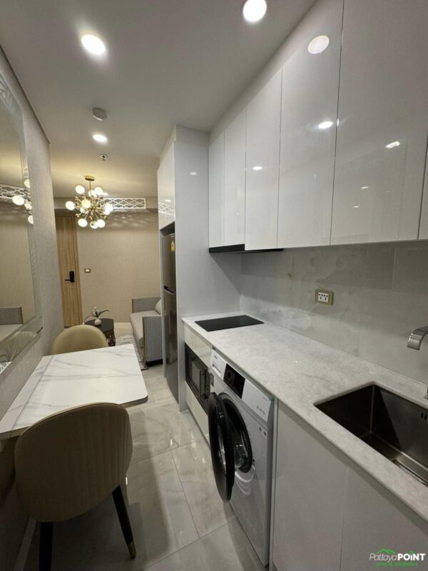 The condo is a 1 bedroom, 1 bathroom unit, measuring 29 square meters (312 square feet) and is located on the 10th floor. It offers a sea view and comes fully furnished, ready to move in.