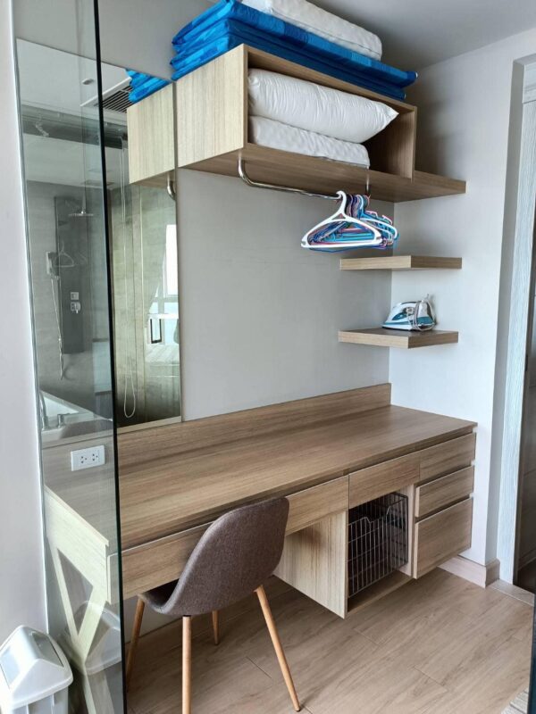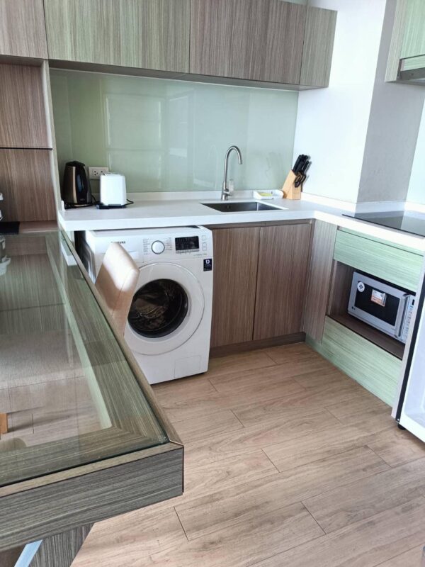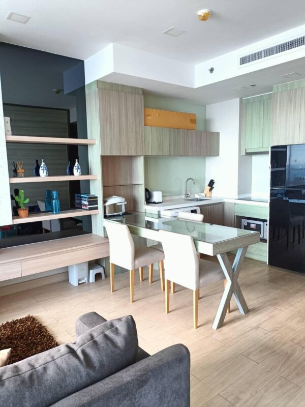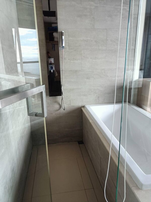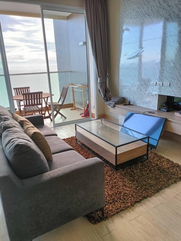 This 1 bedroom unit is 55 square meters at Cetus Jomtien Condo with 360 degree sea views overlooking Koh Larn. There is 1 bathroom and a bathtub. There is a kitchen with everything. Fully furnished such as TV, refrigerator, microwave, air conditioner, on the 35th floor.