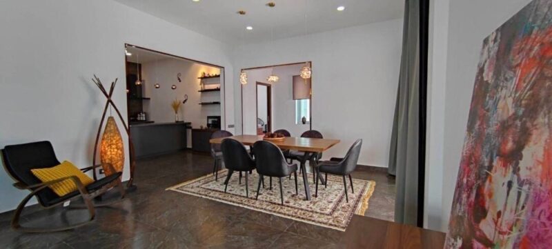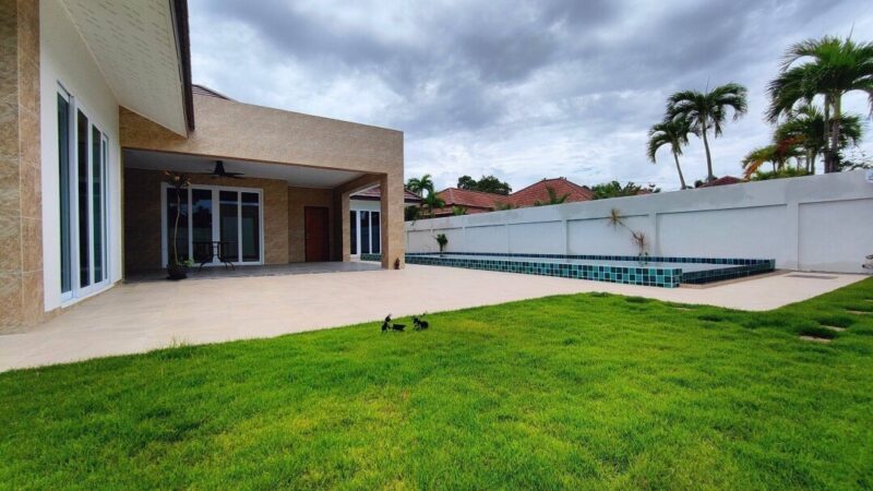 This stunning single-story house in Huai Yai features a modern design with a large private swimming pool. The property boasts spacious outdoor and indoor living areas, surrounded by a serene, well-maintained garden. It has a contemporary architectural style with a mix of stone and white finishes, creating a luxurious and airy feel. Large sliding glass doors connect the living spaces with the pool area, offering seamless indoor-outdoor living. Ideal for relaxation or entertaining, this property is perfect for those seeking a peaceful lifestyle near Pattaya.