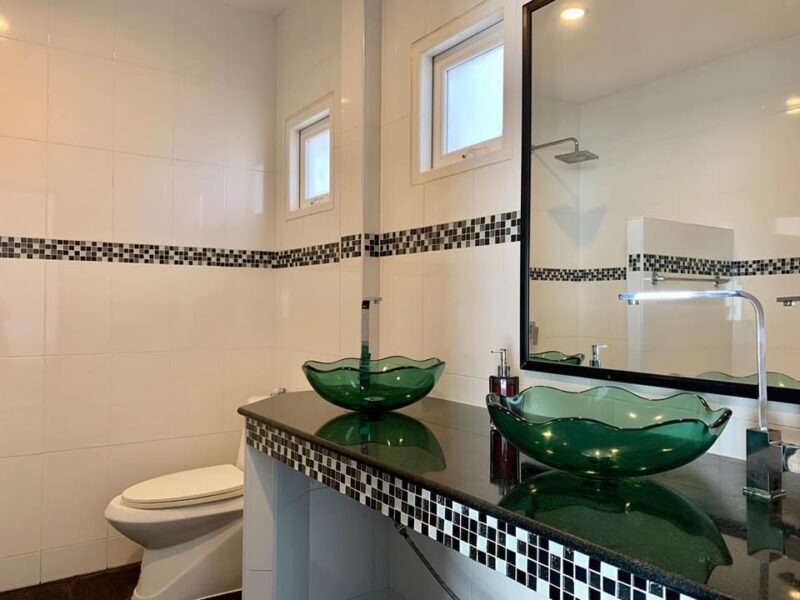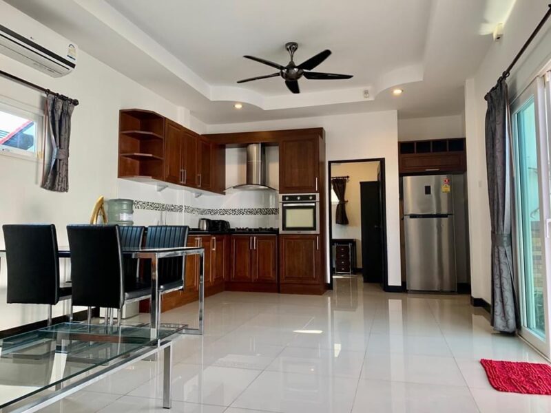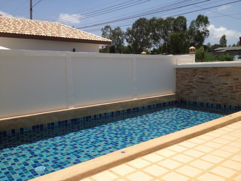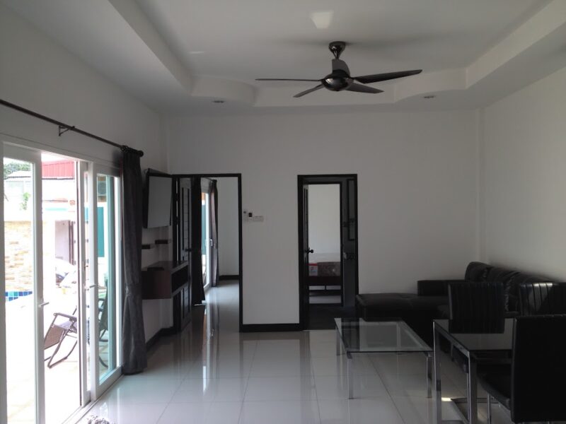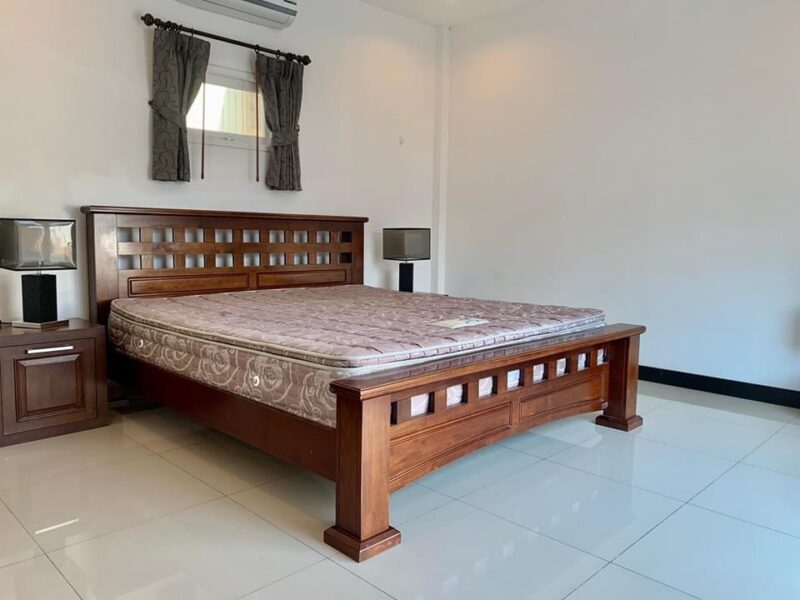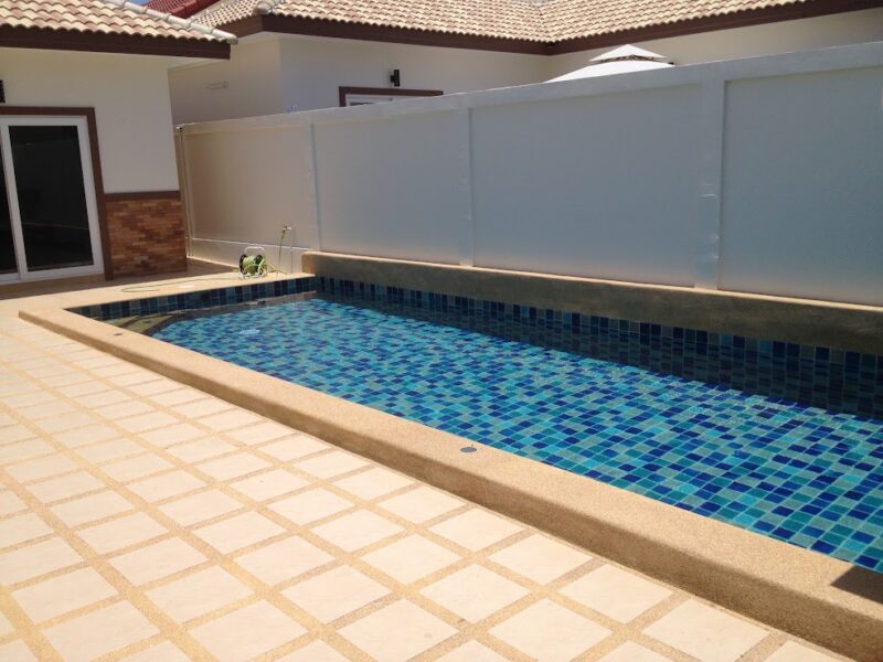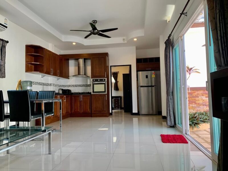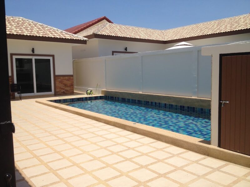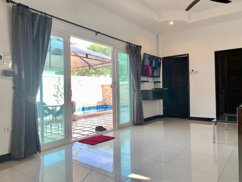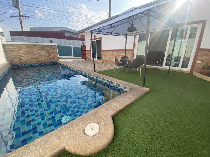This is a single-storey pool villa on an area of 200 square meters and a usable area of 120 square meters. There are 3 bedrooms, 3 bathrooms, a private swimming pool, fully furnished, ready to move in, located in Soi Ning Hin, Pattaya, price 4,900,000 baht.