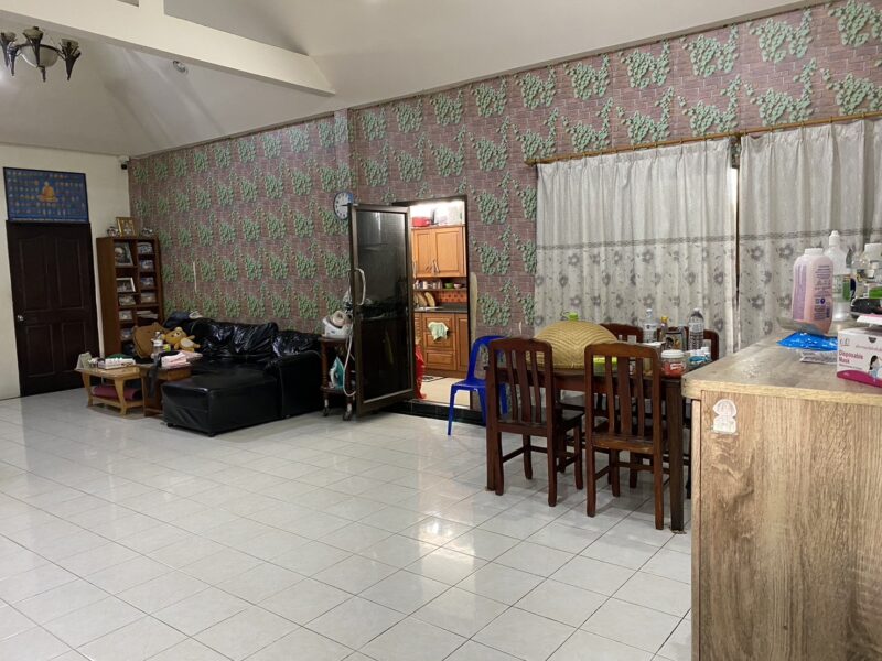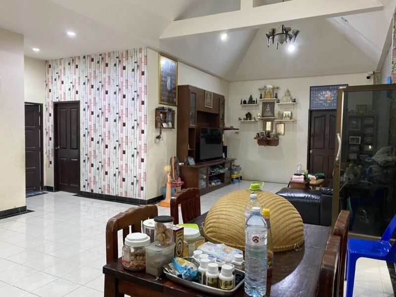 This single-story house on the east side sits on 86 TW of land, offering a spacious and comfortable living space. It includes 4 bedrooms, 2 bathrooms, and a large living room, perfect for families or entertaining guests. The high ceiling design enhances airflow and natural light, creating a bright and airy atmosphere. A separate kitchen provides convenience for cooking, while the outdoor space offers potential for a garden or patio area. The property needs renovation and it is registered under a Thai name, ensuring a smooth ownership transfer. Located in a peaceful residential area east of Pattaya, it provides easy access to local markets, schools, and main roads. The house requires renovation. Location is 15 minutes drive to Pattaya city.