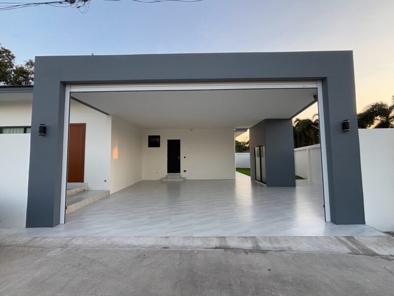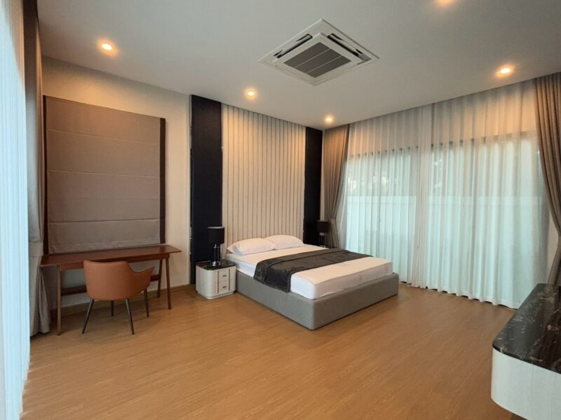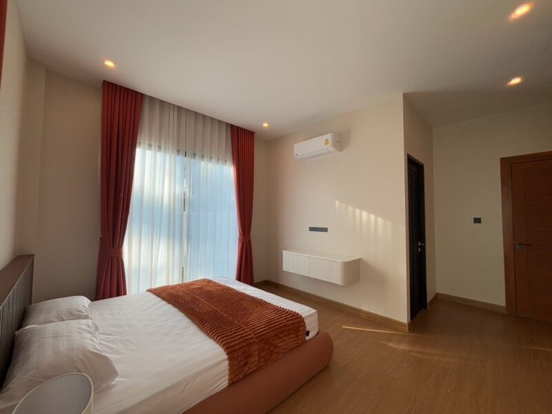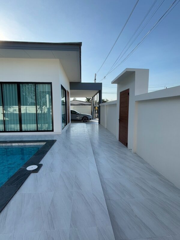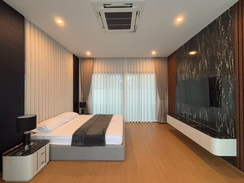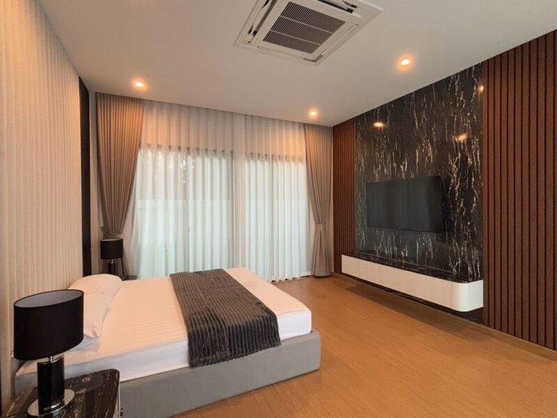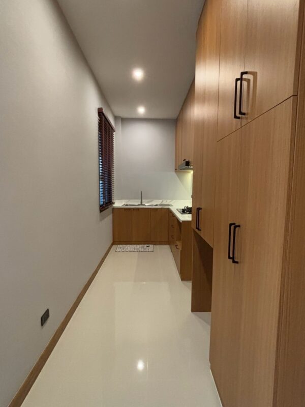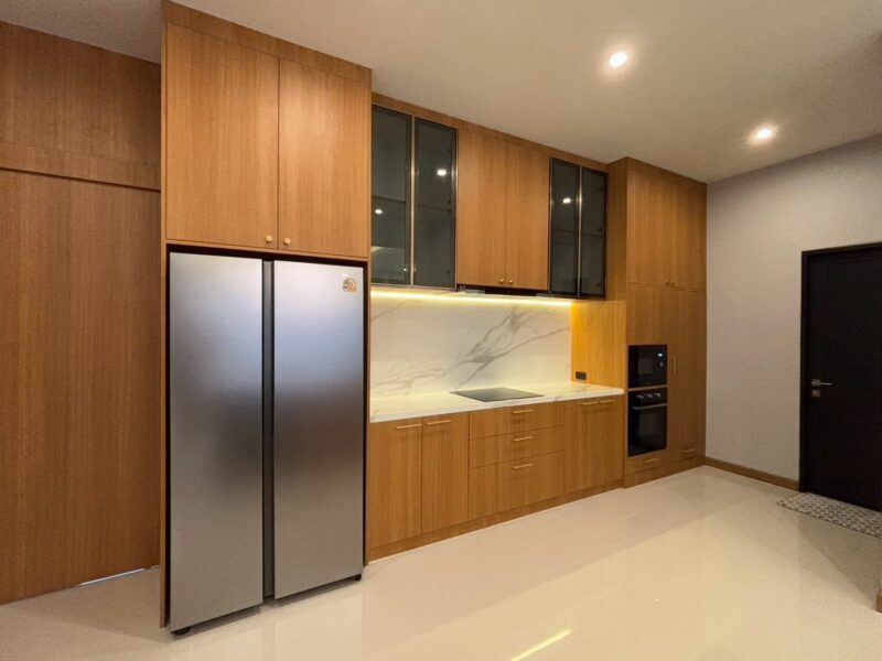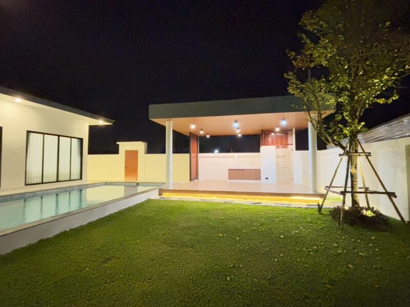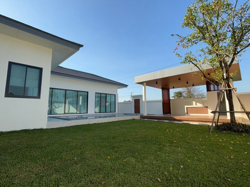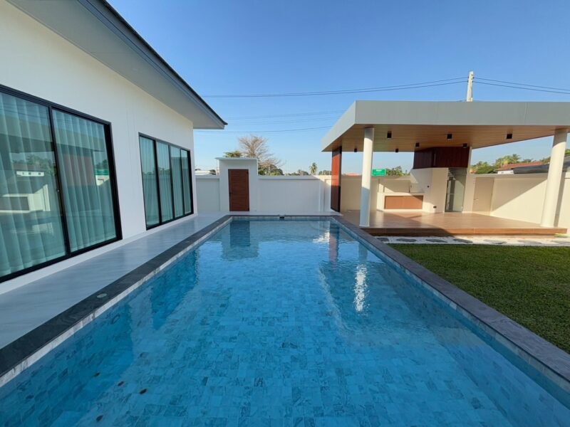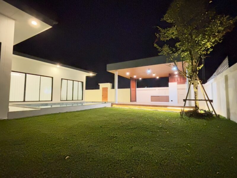 This newly built pool villa sits on a 151 square wah plot, offering a spacious 335 square meters of living space. It features 3 bedrooms, 4 bathrooms, and an 8×4 meter saltwater swimming pool. The property includes a garden, barbecue area, and an outdoor shower. The open-plan living room is complemented by a built-in European kitchen, with an additional Thai kitchen and laundry room. A 48-square-meter garage is provided along with a storage room. The villa comes fully furnished with built-in features, including two large TVs, air conditioning throughout, and appliances like a refrigerator, dishwasher, and induction stove. Additionally, the home supports a smart home system, security cameras, and an alarm system. The villa is equipped with a 1,500-liter water tank, a pump, a water filter, and an automatic irrigation system for the garden.