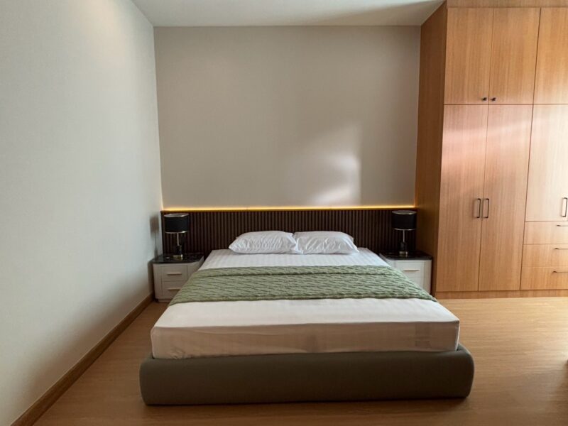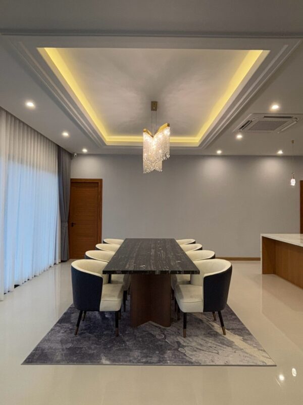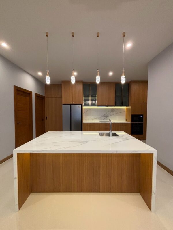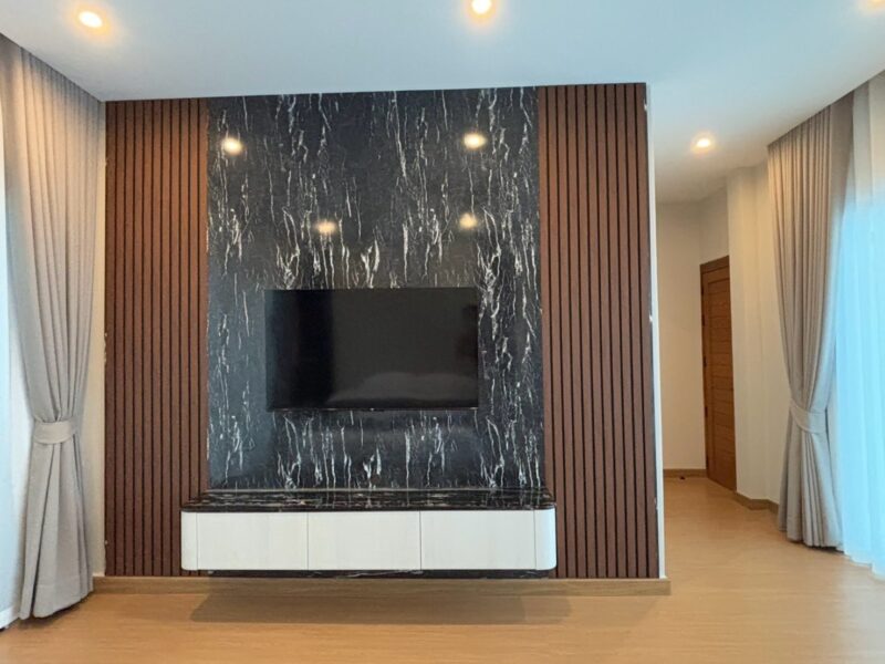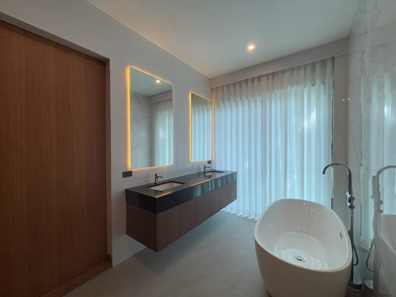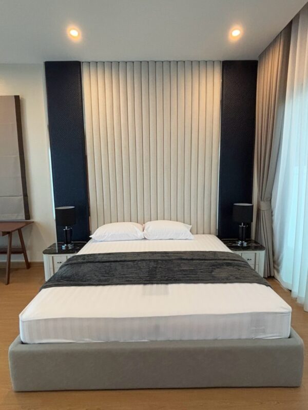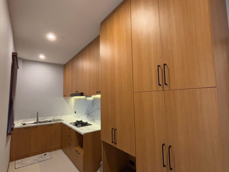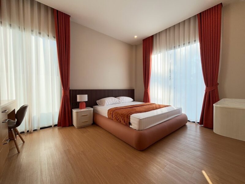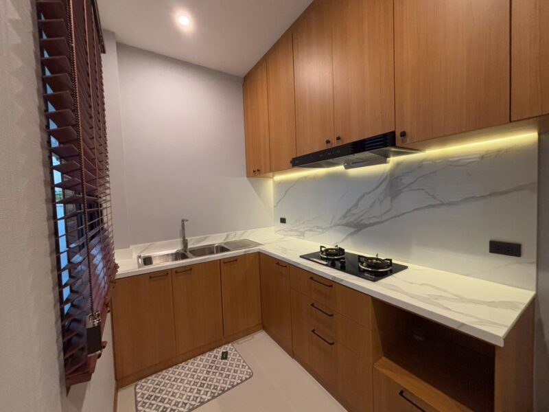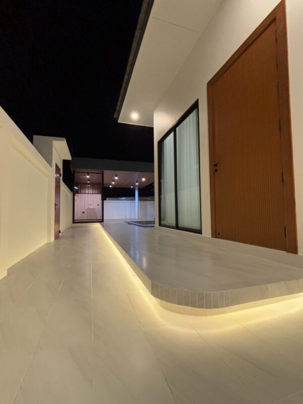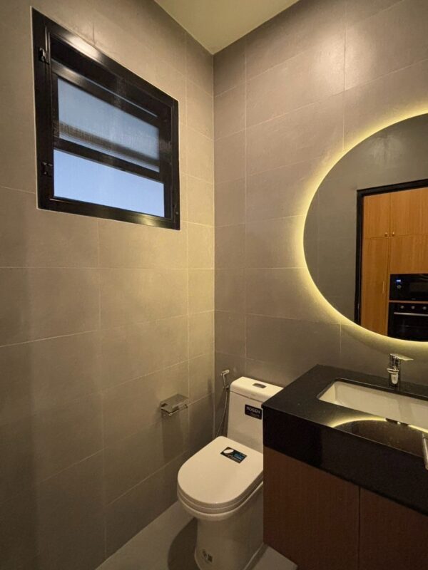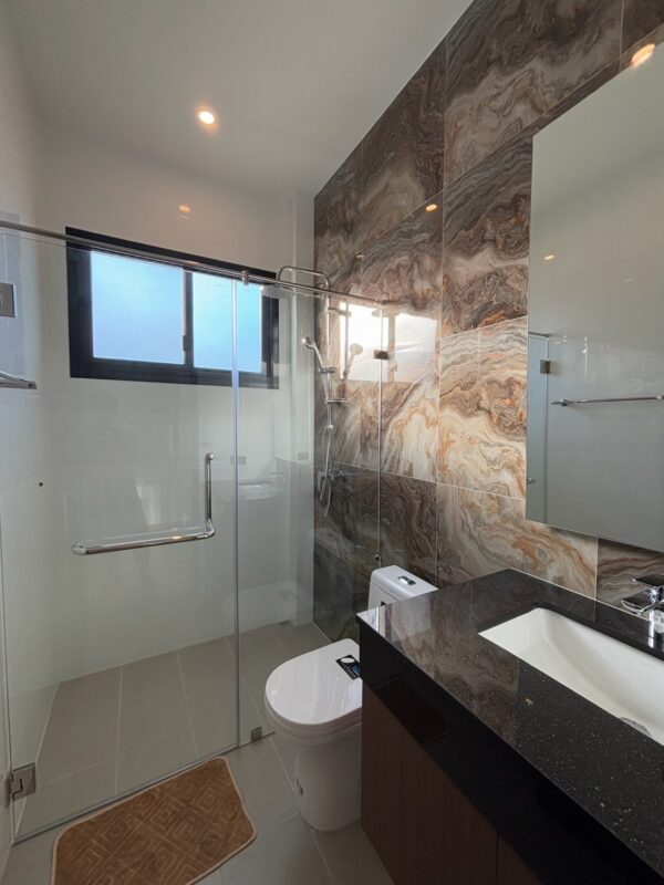 This newly built pool villa sits on a 151 square wah plot, offering a spacious 335 square meters of living space. It features 3 bedrooms, 4 bathrooms, and an 8×4 meter saltwater swimming pool. The property includes a garden, barbecue area, and an outdoor shower. The open-plan living room is complemented by a built-in European kitchen, with an additional Thai kitchen and laundry room. A 48-square-meter garage is provided along with a storage room. The villa comes fully furnished with built-in features, including two large TVs, air conditioning throughout, and appliances like a refrigerator, dishwasher, and induction stove. Additionally, the home supports a smart home system, security cameras, and an alarm system. The villa is equipped with a 1,500-liter water tank, a pump, a water filter, and an automatic irrigation system for the garden.