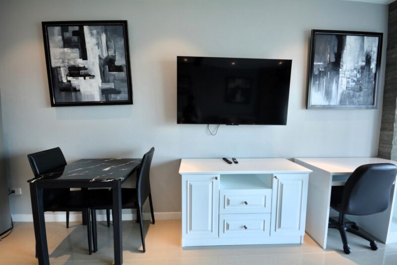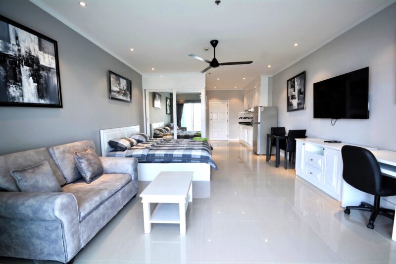 This is a newly refurbished studio condo in View Talay 5D, located in the popular Jomtien area of Pattaya. The unit offers 48 sq.m. of living space with a large private balcony that provides stunning sea views. It comes fully furnished and includes a modern European-style kitchen, air conditioning, balcony furniture, and a spacious modern bathroom with a large shower. The open-plan layout is bright and comfortable, making it perfect for both long-term living and holiday stays. The condo is held under a company name, which makes the transfer process simple and cost-effective. The building provides excellent amenities including a communal swimming pool, direct beach access, 24-hour security, and convenient on-site services. The unit is available for sale at 2.75 million THB or for rent starting from 19,000 THB per month. With its prime location, sea views, and modern upgrades, this condo is an excellent option for both buyers and investors.