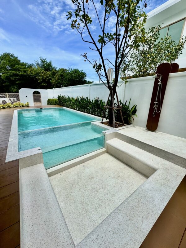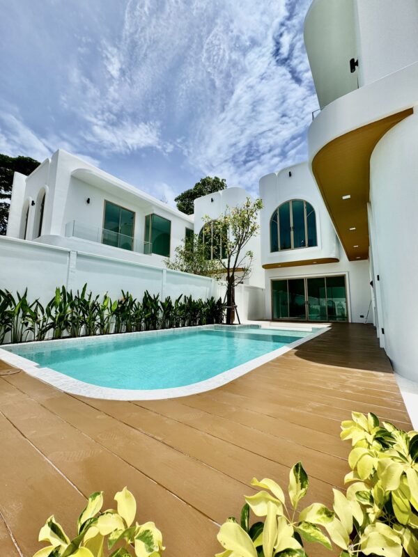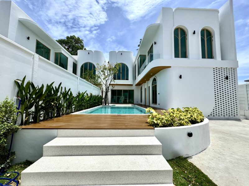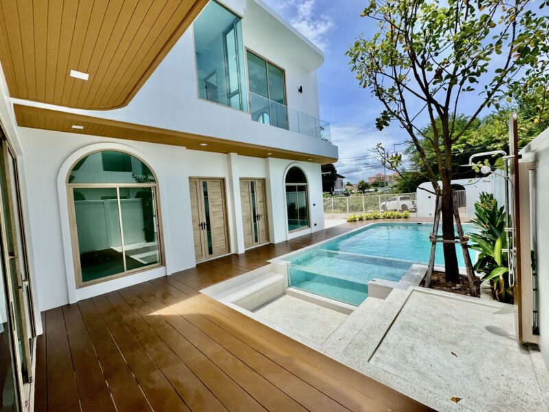 House for sale in Jomtien, just a short walk from the beach. Priced at 21,500,000 Baht, this property offers excellent value in a prime location. It sits on a land plot of 88 square wah, providing ample outdoor space for a garden or pool. The home features a spacious interior living area of 269 square meters across two floors. There are 5 generously sized bedrooms and 6 bathrooms, perfect for large families or entertaining guests. Its layout offers flexibility for either full-time living or a vacation residence. The house is offered unfurnished, allowing new owners to design and furnish to their own taste. Located in a quiet Thai neighborhood, it offers peaceful living just steps from Jomtien Beach.