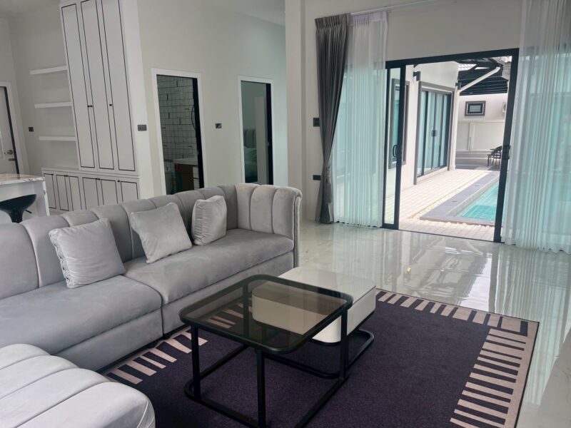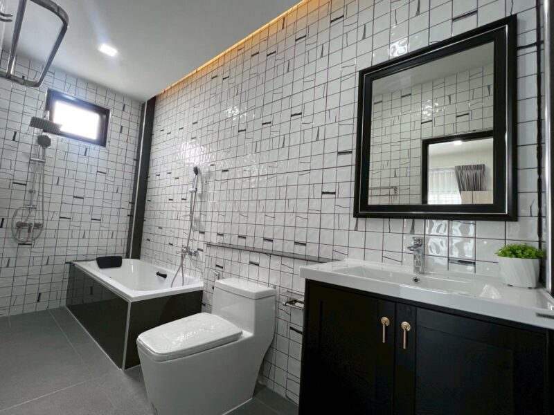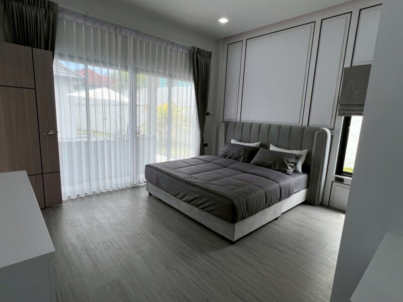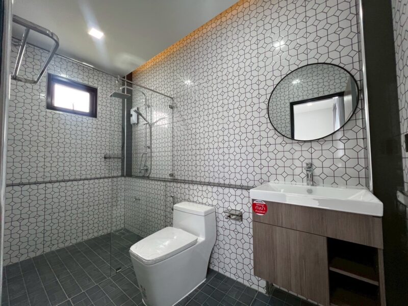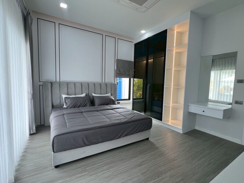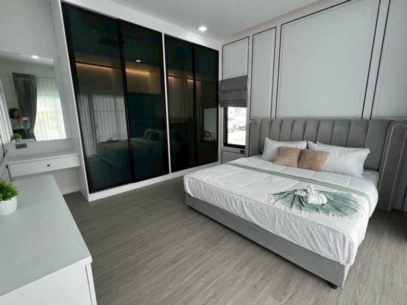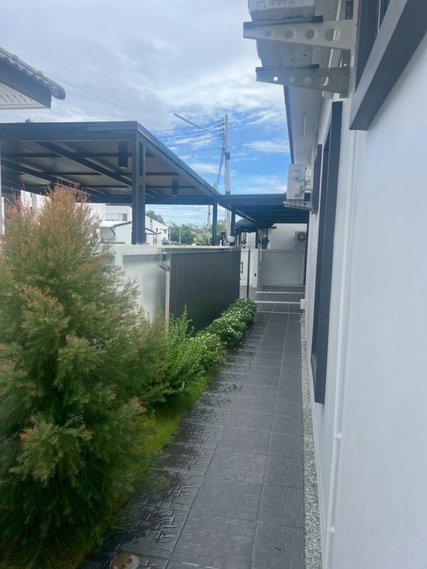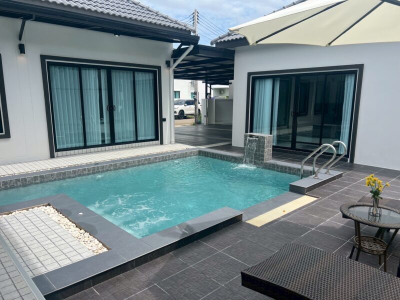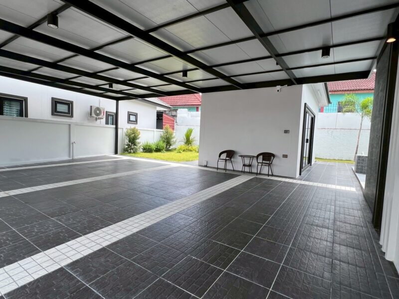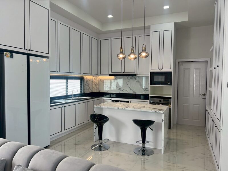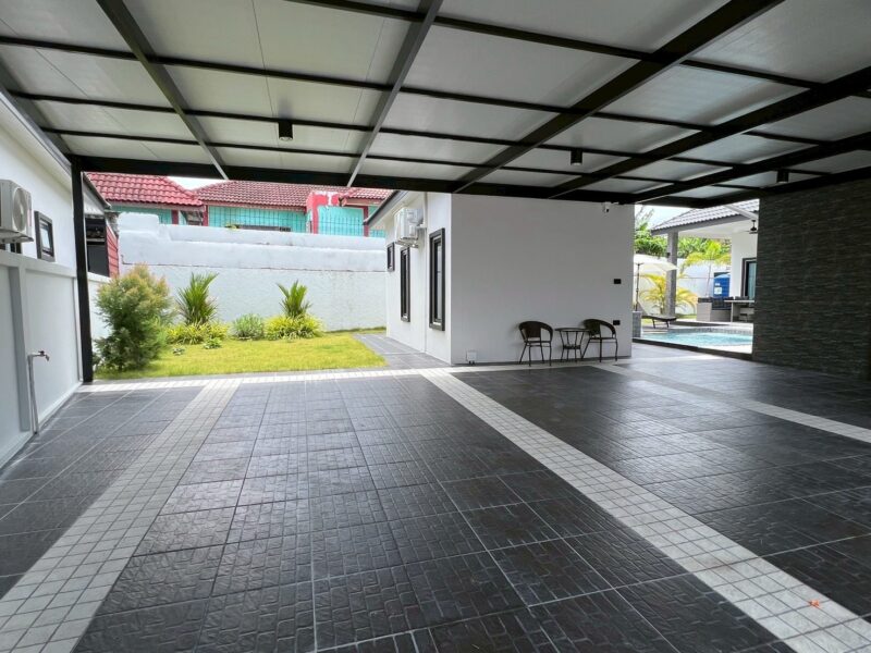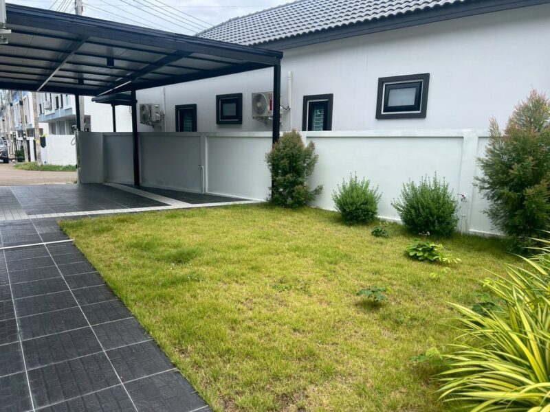 4 bedrooms, 4 bathrooms, 1 living room, kitchen, all bedrooms are pool view, 120 Sq.wah ( 480 Sq.meters). Double cars parking. Saltwater overflow pool size 7 x 4 x 1.3 meters. 24 hours security. The village is located on enter an alley. Prime location, house facing no other property, beautiful house, good location, affordable, no flooding, Convenient transportation, easy access. Located in a community area, near markets, 7-eleven and schools.
