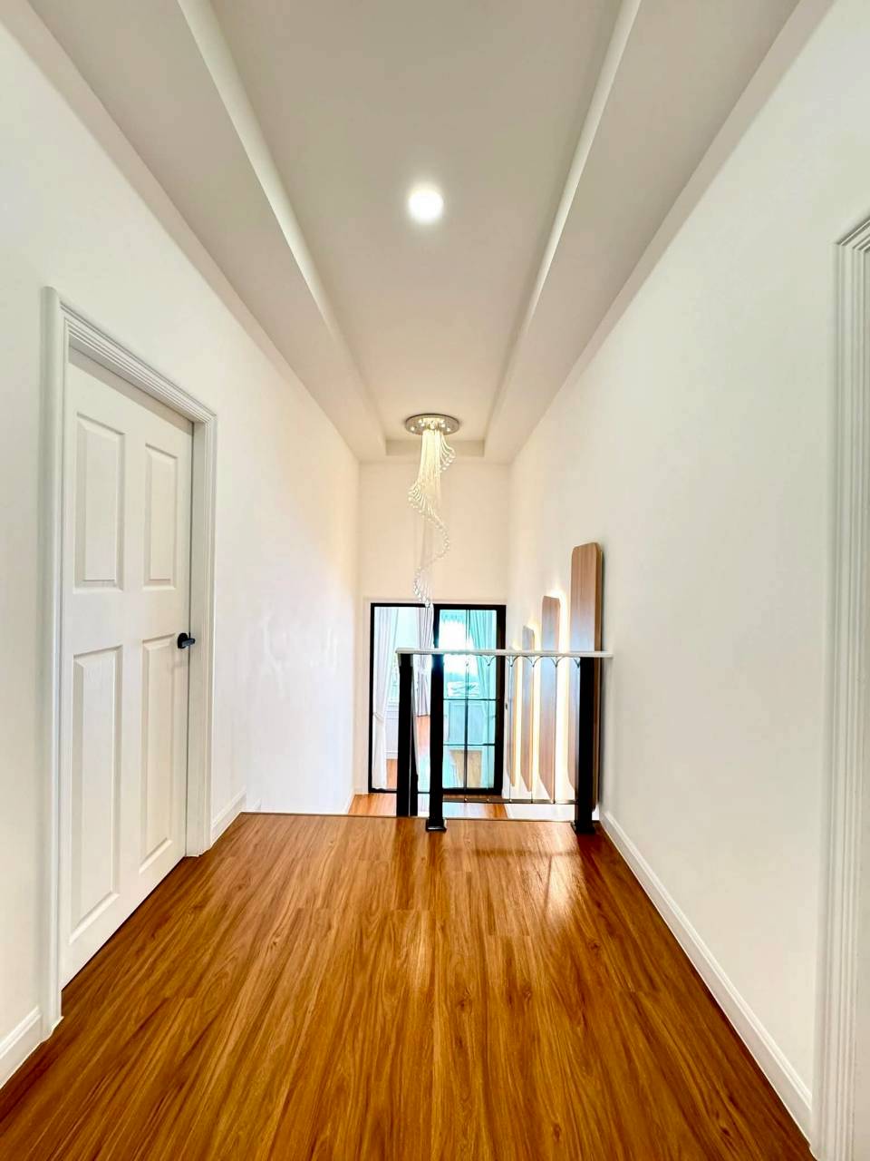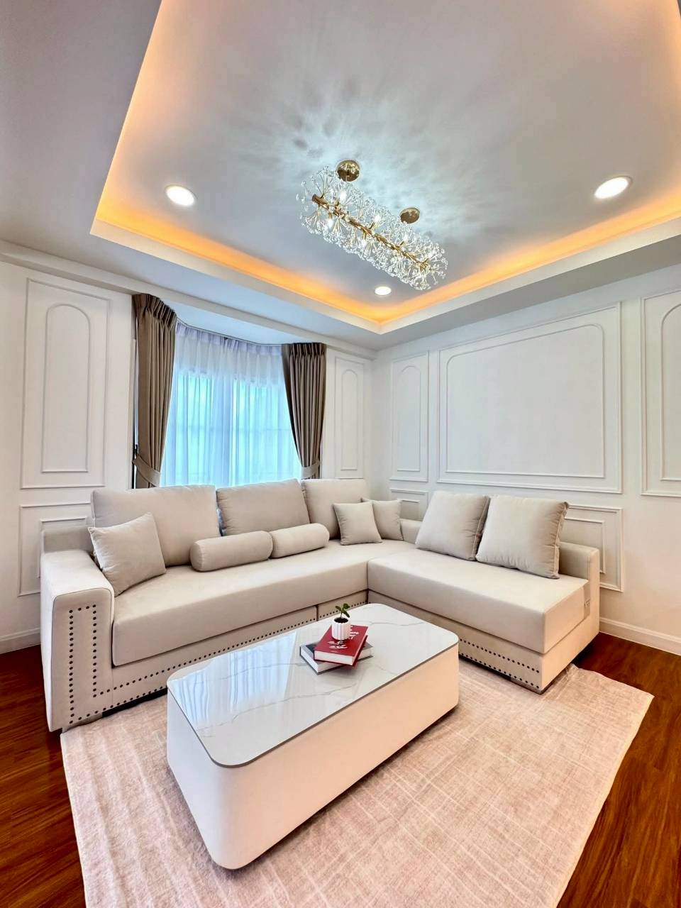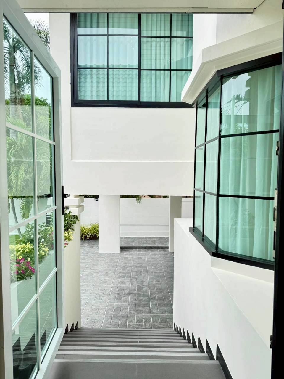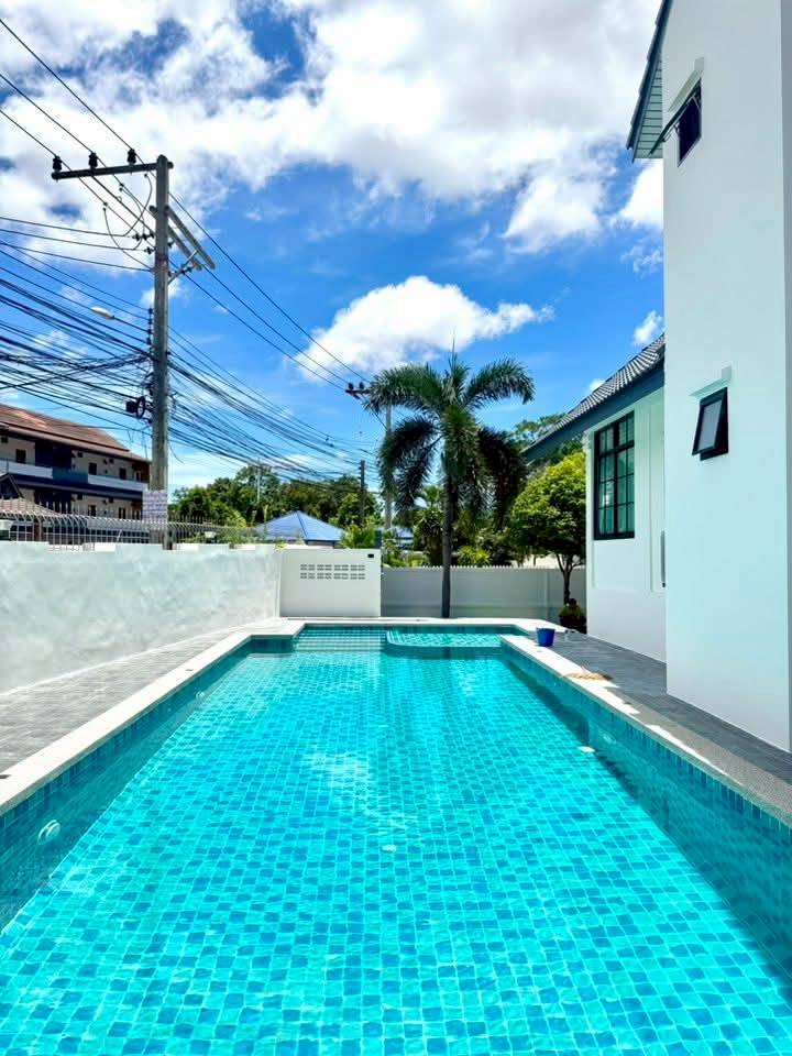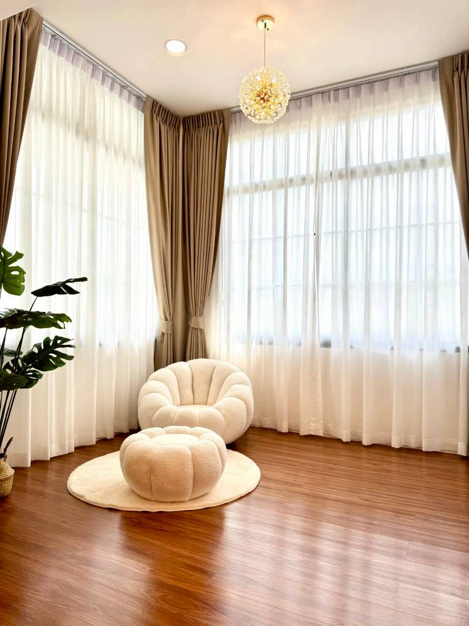 This modern 3-storey house sits on 122 square wah (488 sqm) of land with a total usable area of 561.42 sqm. The interior living space measures 219.54 sqm, distributed across three floors: 106.66 sqm on the first floor, 54.38 sqm on the second floor, and 58.5 sqm on the third floor. The property features 4 spacious bedrooms, 6 bathrooms, and a large private swimming pool measuring 4.5 meters by 15 meters.