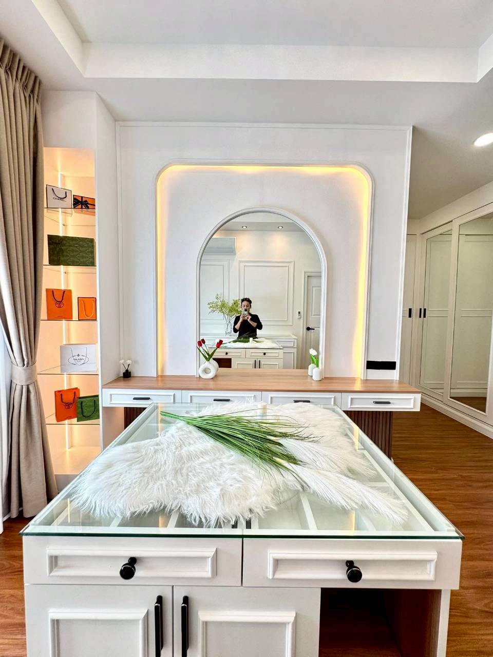 It comes fully fitted with built-in furniture and high-quality electrical appliances, including multiple air-conditioning units, a Samsung 9kg washing machine, oven, stove, hood, refrigerator, and a 65-inch TV.