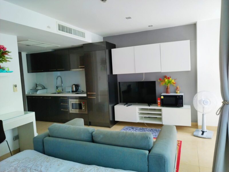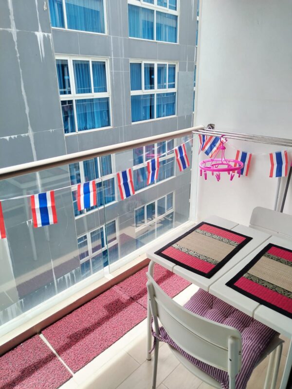 The room features a city view, providing an open and pleasant atmosphere. It comes fully furnished and is ready for immediate move-in. The unit is well maintained and suitable for both short stays and extended living. The rental price is 18,000 Baht per month, offering good value for its location and condition.