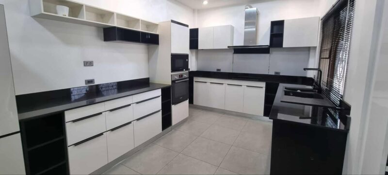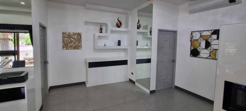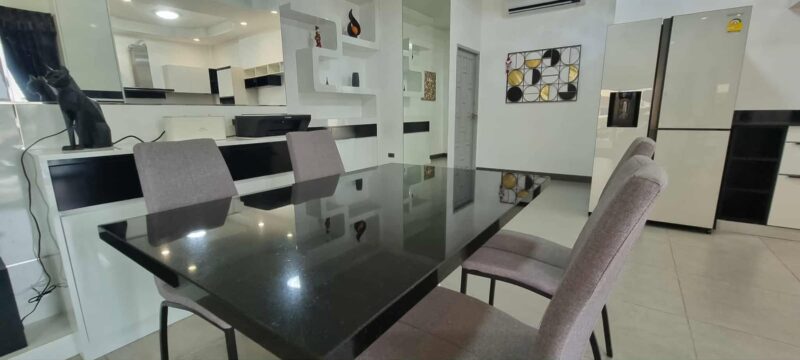 This renovated pool villa is offered for sale at 10,800,000 THB and is located near Maprachan Lake, a popular and peaceful residential area. The property features 3 bedrooms, with one room currently set up as a home office. There are 3 bathrooms, with one bathroom also serving as a laundry area. The land size is 100 sq.wah (400 sqm), providing generous outdoor space. The villa has a living area of 140 sqm, designed for comfortable modern living. It has been fully renovated and is in excellent condition throughout. The house is sold fully furnished and ready to move in. The kitchen is fully equipped with complete appliances, including an induction hob, oven, microwave, dishwasher, and washing machine.