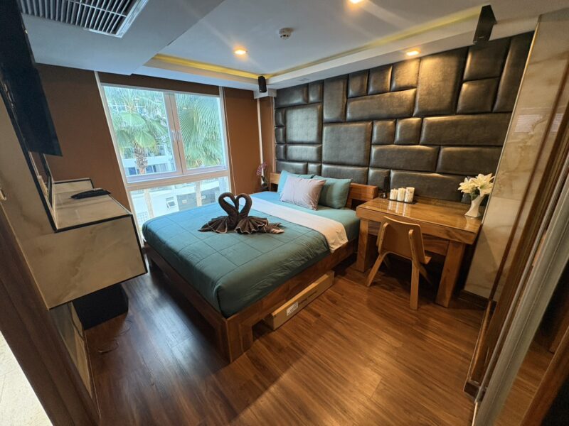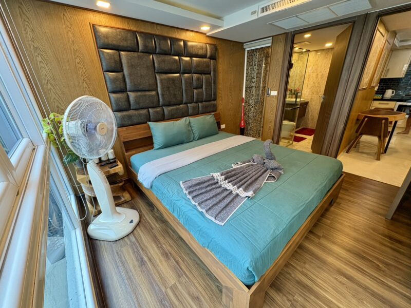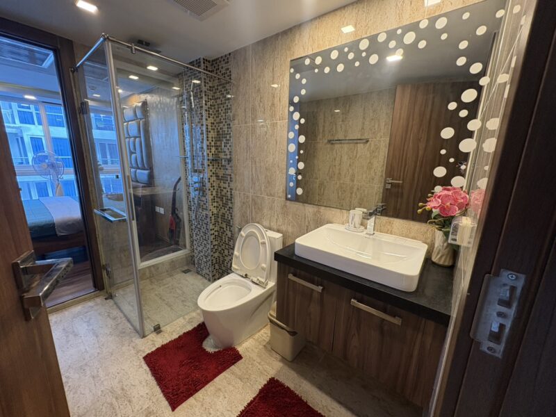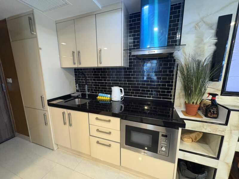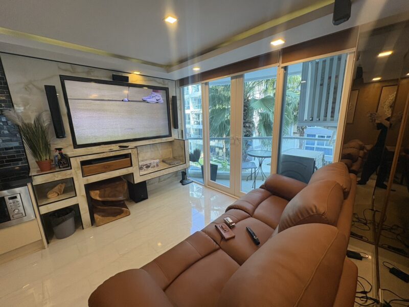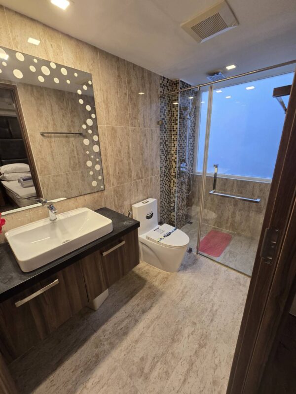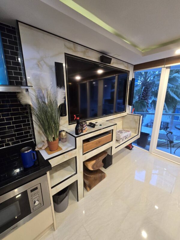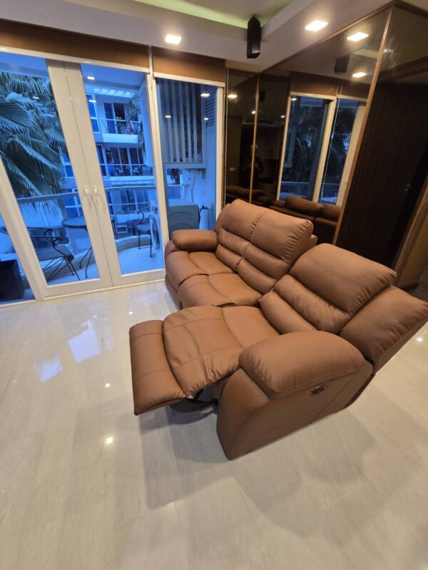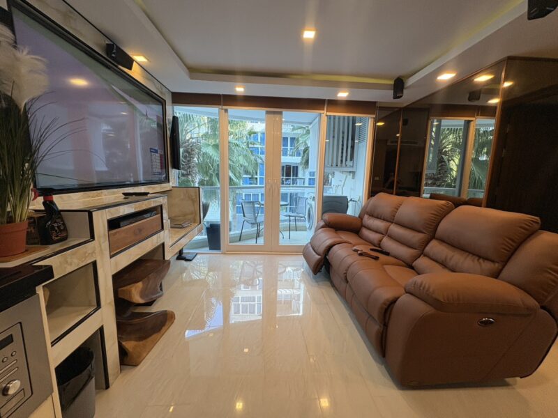 The unit stands out with premium interior upgrades and high-quality materials throughout. All walls feature elegant wood paneling and mirrors, creating a modern and luxurious atmosphere. The TV cabinets are finished with stylish marble tiles. The living room includes a double electric Lazy Boy sofa for maximum comfort.
